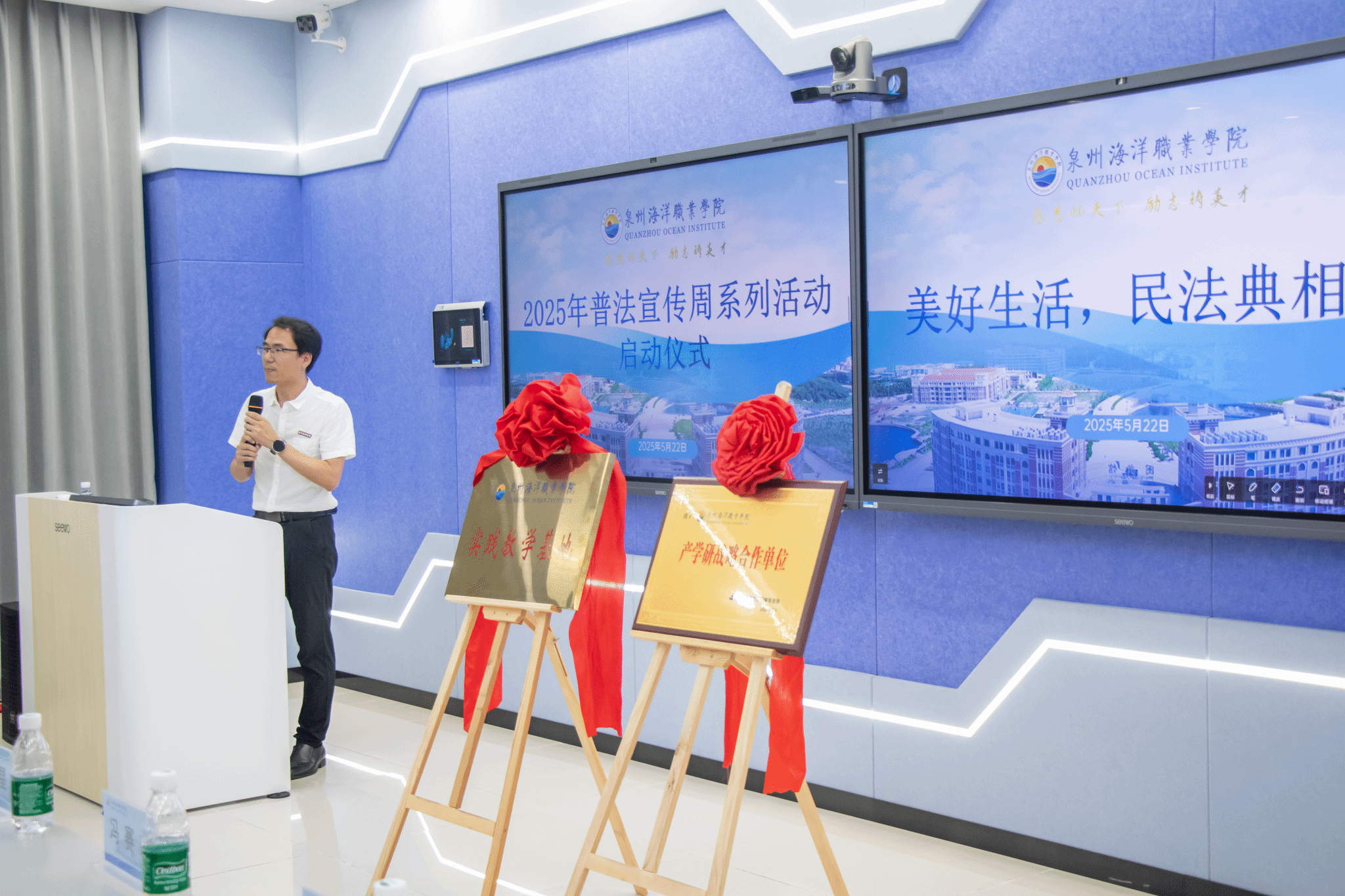 揭牌仪式结束后,校党委副书记、副校长李明灿致辞并宣布泉州海洋职业学院2025年普法宣传周系列活动正式启动。