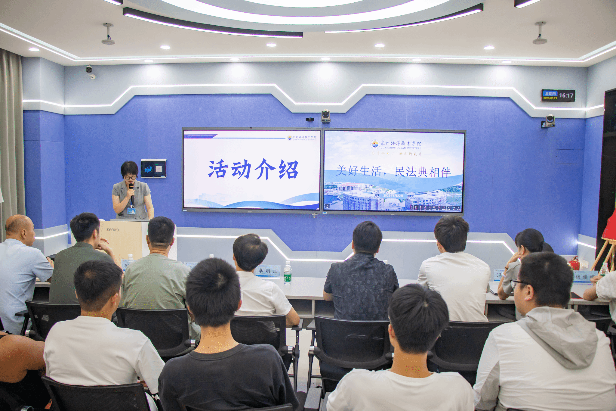 本次活动由法务处、党委学生工作部联合召集。会上,法务处王培红老师系统阐述了 2025 年普法宣传周系列活动。据介绍,今年普法宣传周,学校将围绕“美好生活,民法典相伴”“法影传情,共筑法制校园”“法润人心,共筑和谐”三大主题,分别开展普法知识讲座、普法短视频征集大赛和普法知识竞赛等活动,持续推动法治教育融入校园生活。现场,王老师特别就普法短视频征集大赛、普法知识竞赛等创新环节的操作流程与参与规则进行了详细说明。
