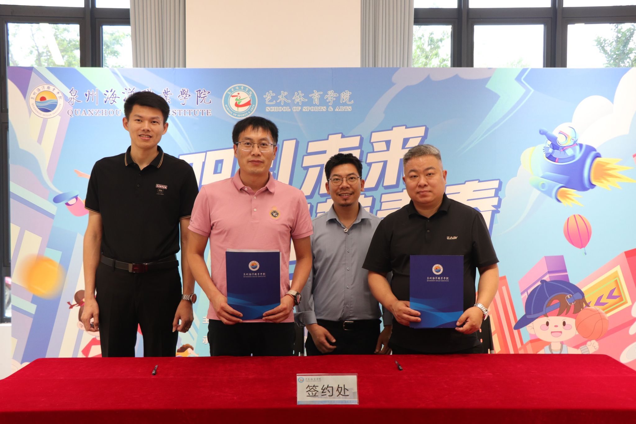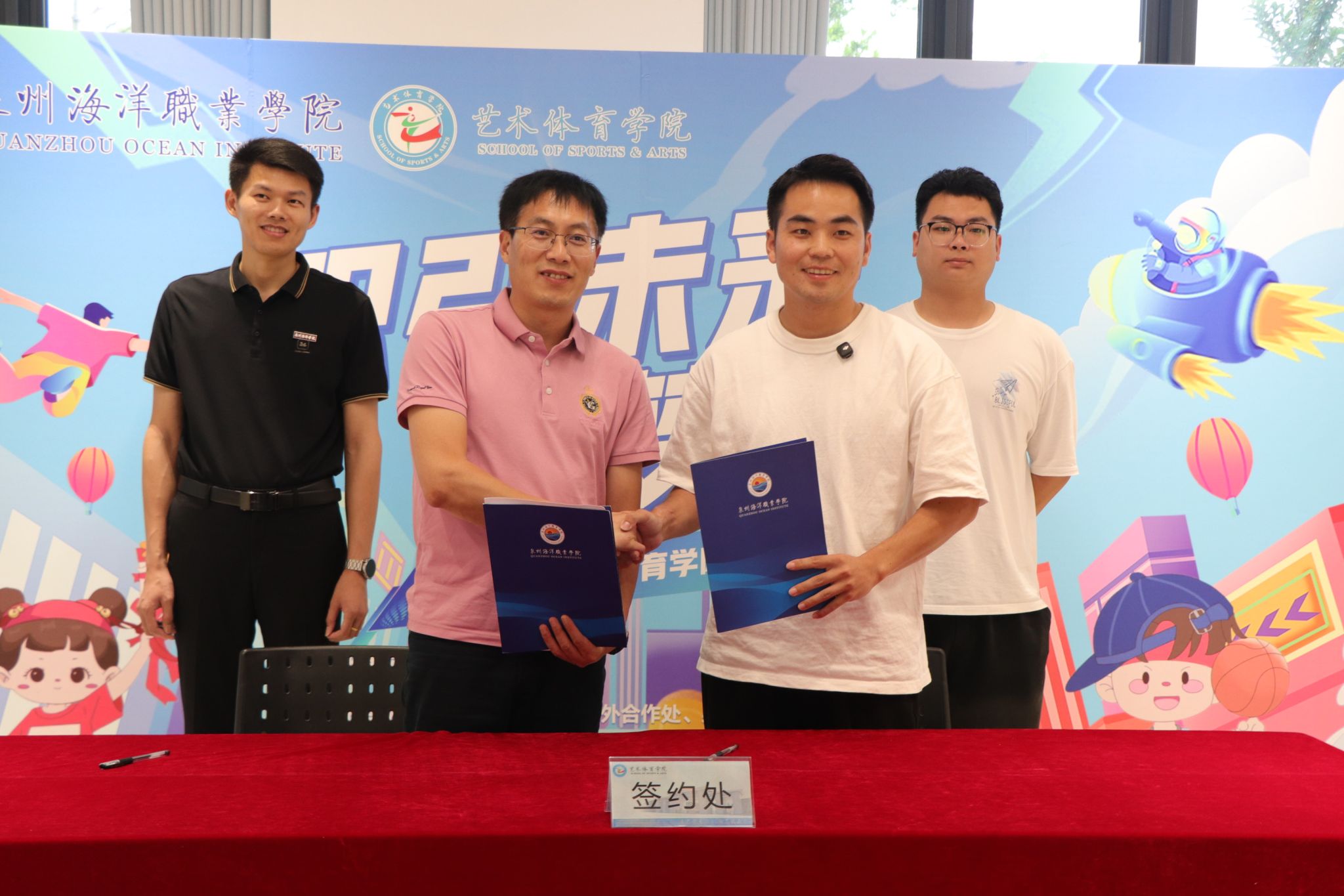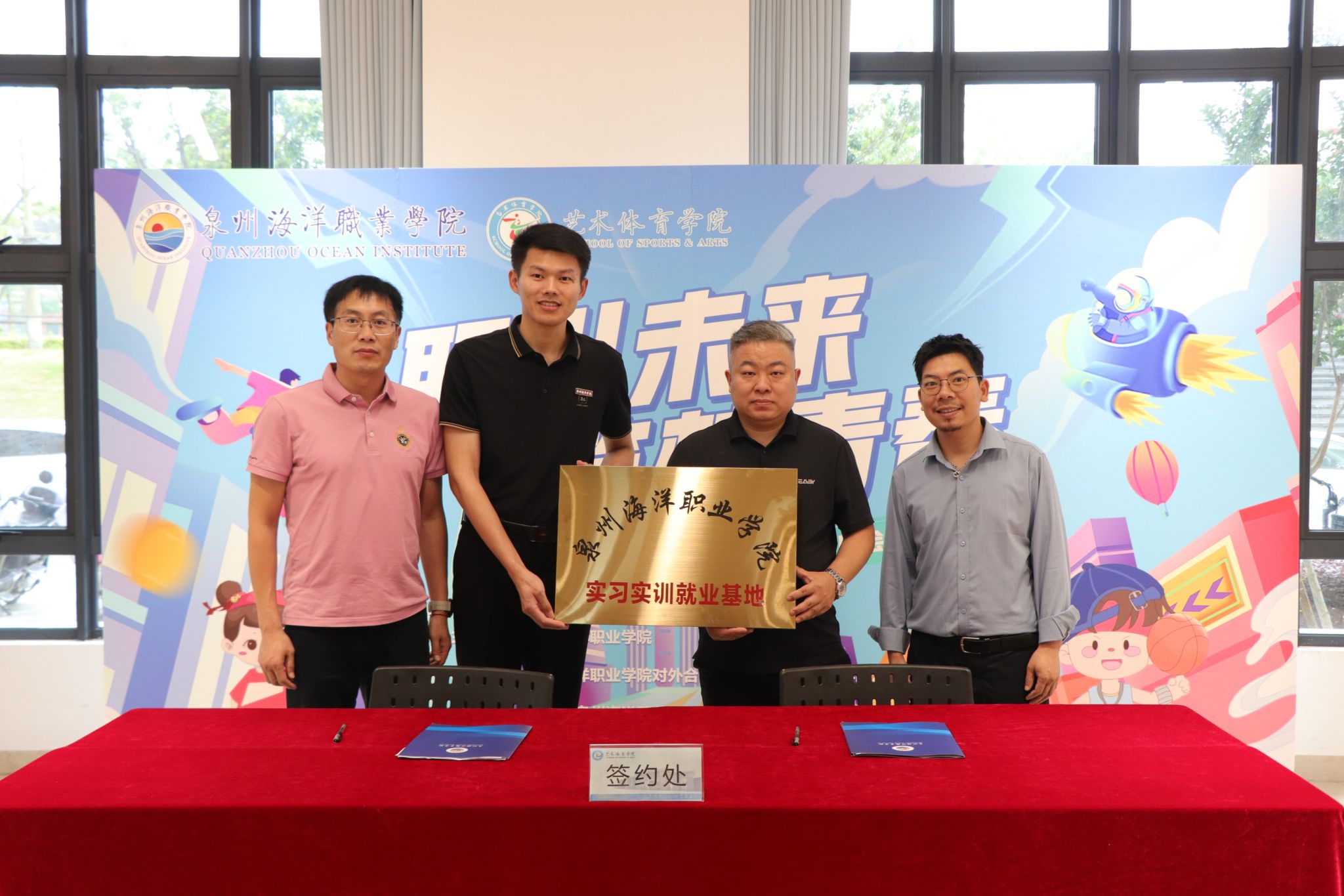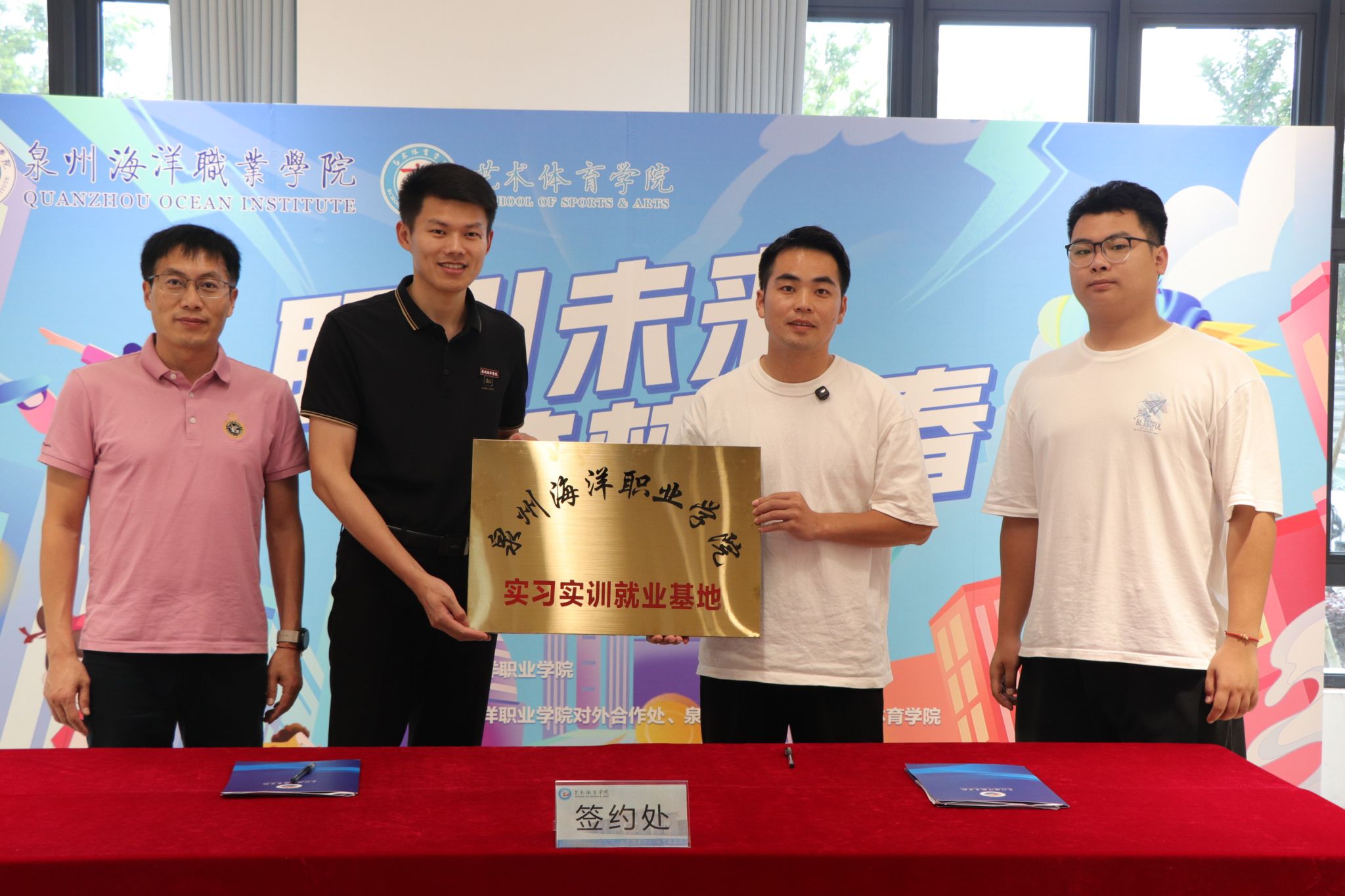 招聘会上,艺术体育学院院长孙玉坤、书记陈绍勇代表学校分别与鹭元堂(厦门)大健康产业发展有限公司、石狮市聚泳体育文化传播有限公司两家知名企业签订了校企合作协议,并颁授了“实习实训就业基地”牌匾。