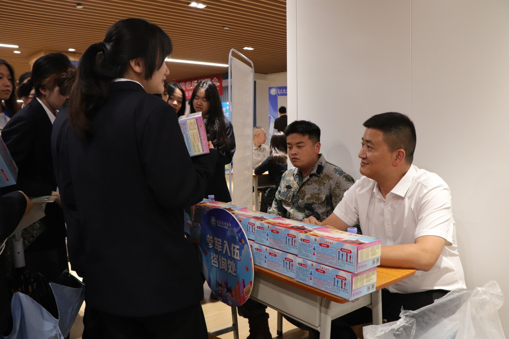 为了更好地满足毕业生多样化的求职需求,艺术体育学院特别邀请学校武装部及相关职能部门,在招聘会现场设立升本咨询处、参军入伍咨询处、基层服务咨询处等多个服务专区。