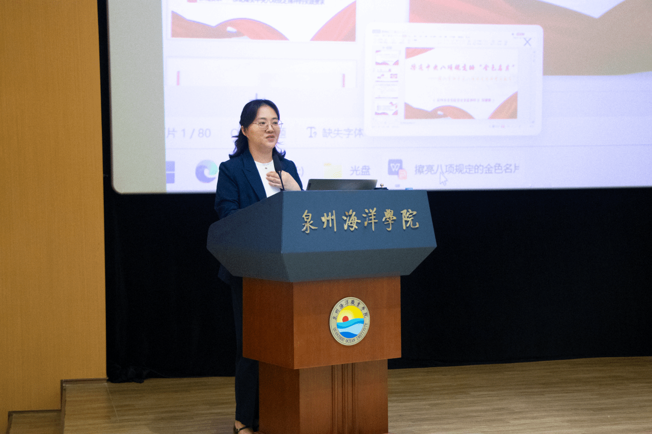 培训特邀泉州市委党校党史党建教研室讲师周姗姗来校开展《擦亮中央八项规定的“金色名片”》专题讲座,深刻阐述中央八项规定精神的理论根基、精神内涵及其实施成效,加深学员对党的作风建设的重要性认识,对中央八项规定及其实施细则精神的理解,树立“清正廉洁”的价值底色。