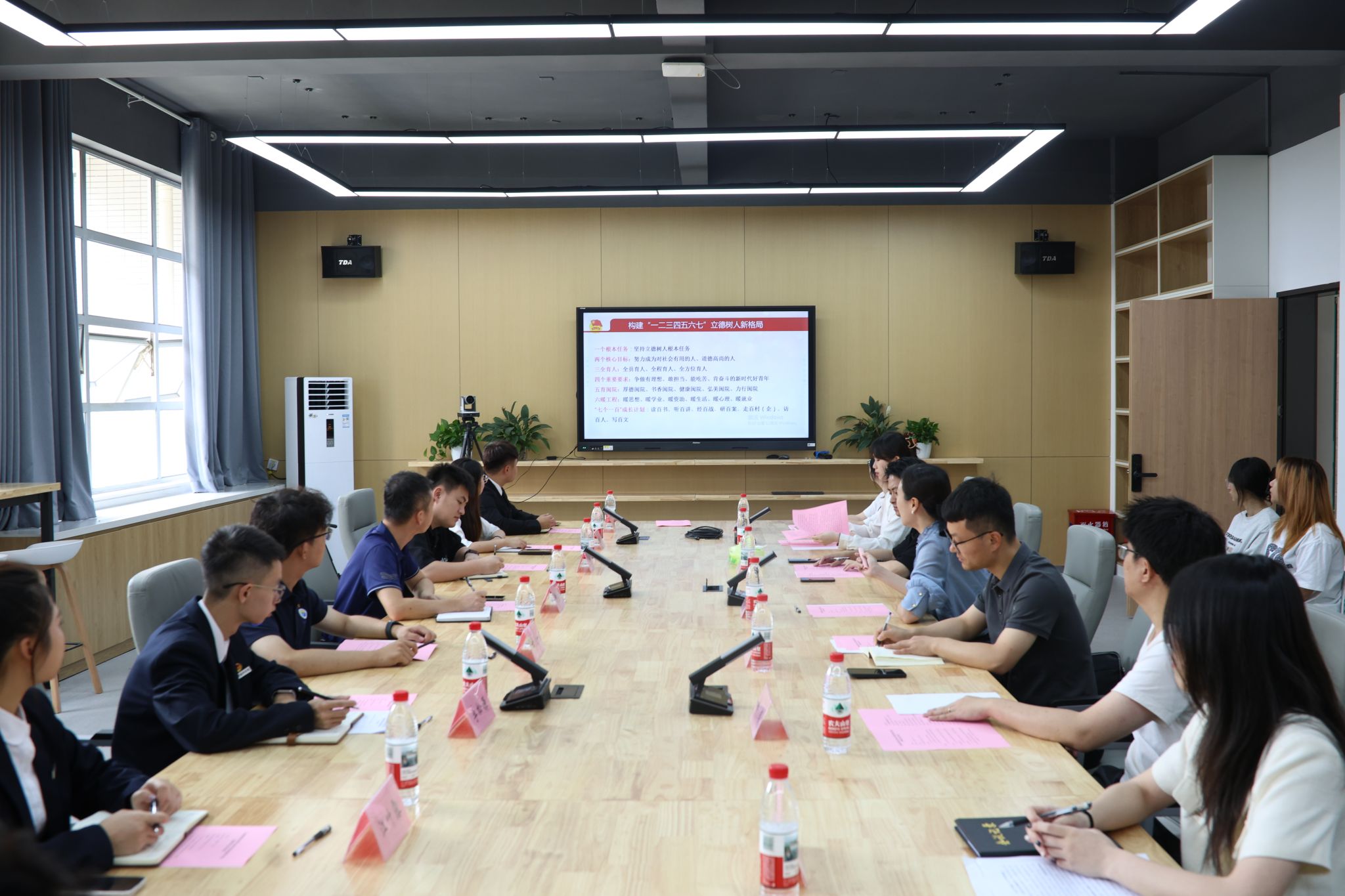 参观结束,双方在美术学院会议室举行交流研讨会。闽江学院团委书记王艳婷介绍了闽江学院的团组织建设、闽院青年说以及团委日常工作的特色做法,重点分享“校史+思政+专业”育人模式。余斐虎表示,闽江学院办学理念与共青团工作经验极具价值,期待双方深化合作。两校代表还围绕学生会建设、社团发展等话题展开热烈讨论,现场气氛十分活跃。