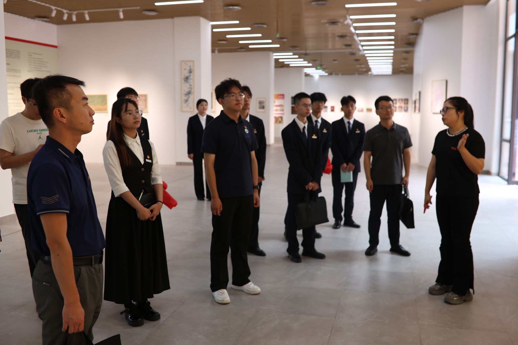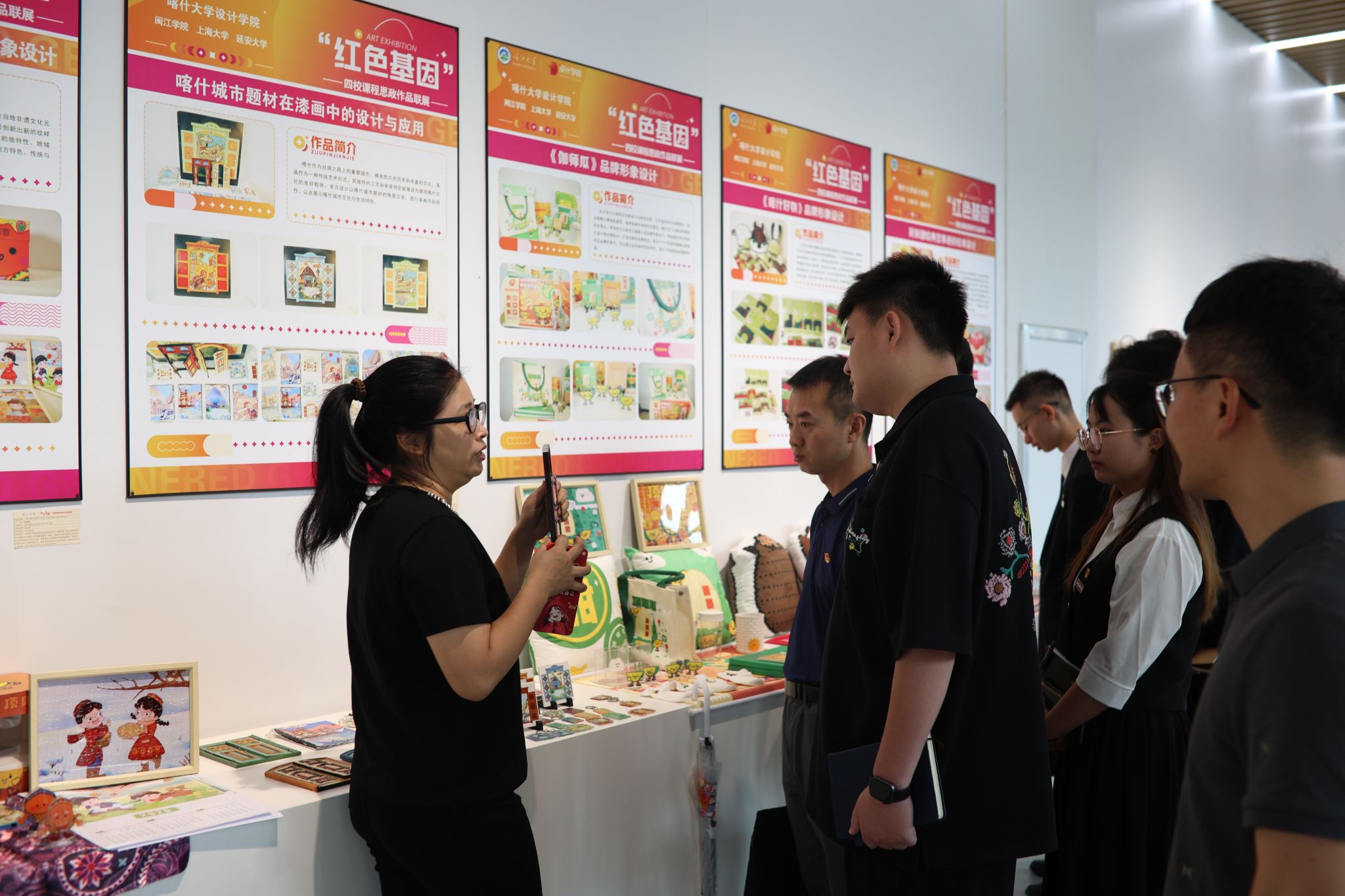 紧接着,交流团前往美术学院,参观“红色基因——四校课程思政作品联展”。此次联展由闽江学院美术学院等四校联合主办,精选200余件课程思政作品。这些作品以艺术为载体融入红色基因,通过多样形式展现不同地域红色文化视野下艺术与思政教育的深度融合,为泉州海洋职业学院课程思政建设提供宝贵借鉴。