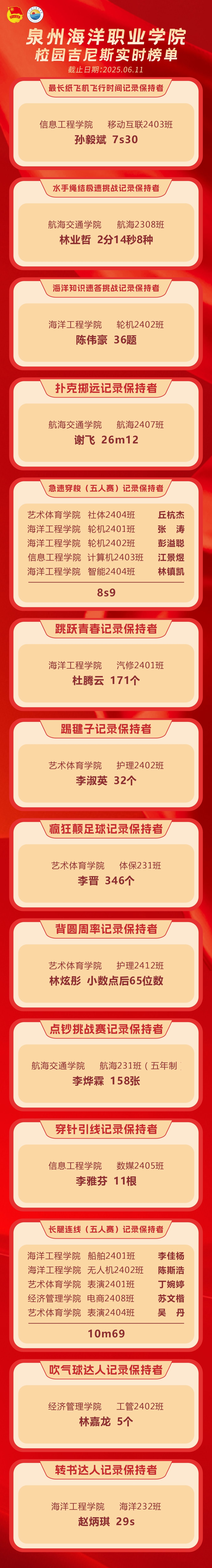 此次校园吉尼斯活动的成功举办,不仅丰富了同学们的课余生活,激发了大家的潜能,更营造了积极向上、勇于挑战的校园氛围。激励同学们在今后的学习和生活中,始终保持这种挑战自我、超越极限的精神,勇敢追逐梦想,创造更加精彩的未来。“校园吉尼斯”,将在未来为同学们提供更多展示自我的平台,助力学生全面发展。