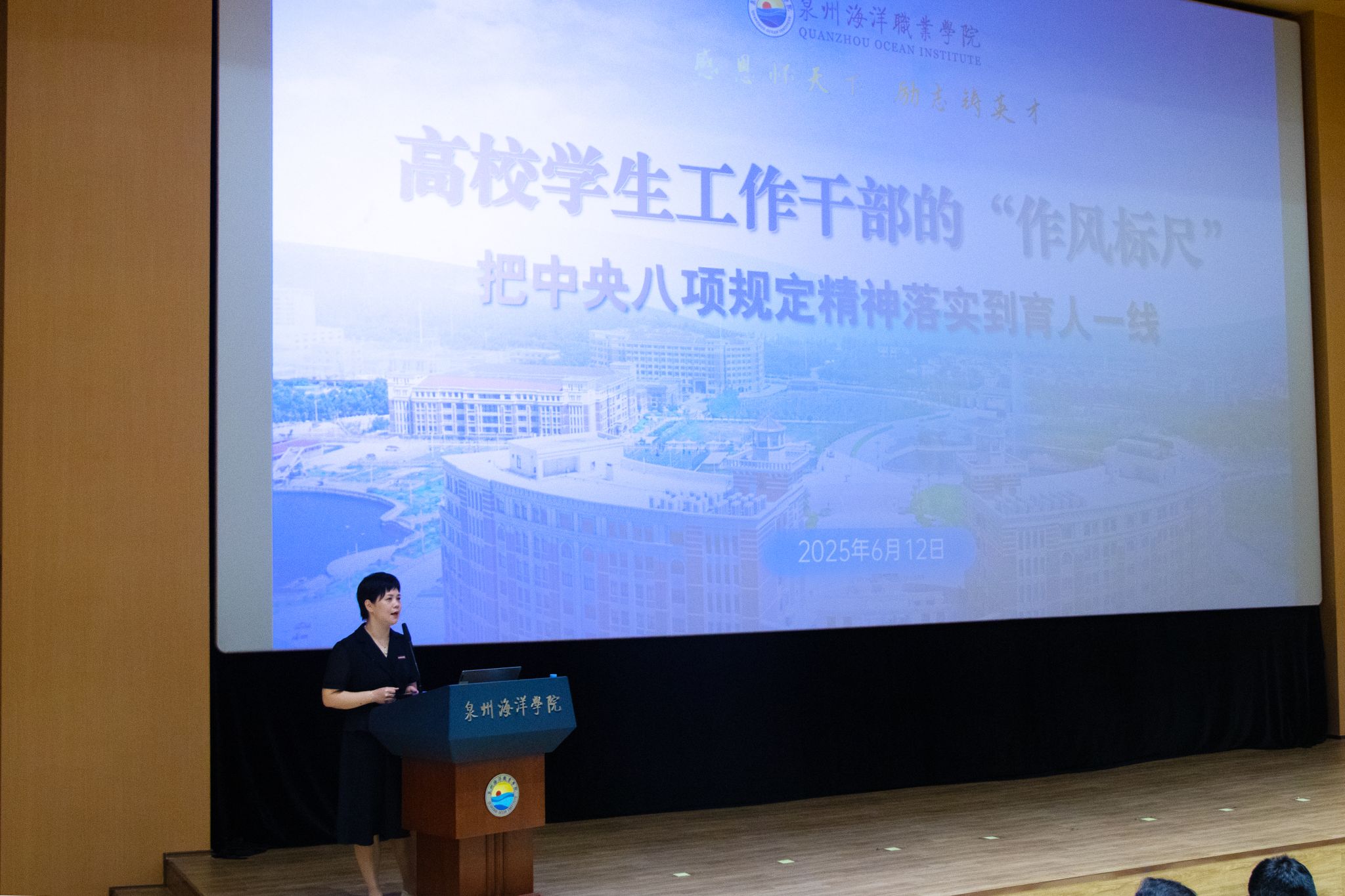 (新闻中心讯 党委学工部供稿 党委宣传部报道)6月11日,校党委书记郑艳以《高校学生工作干部的“作风标尺” 把中央八项规定精神落实到“育人一线”》为题,为全体学生工作干部讲授专题党课,旨在深化全体学工干部对中央八项规定精神的理解和把握,引导其以作风建设推动育人质量提升,切实将纪律要求落实到育人一线。党委学工部成员,各二级学院党总支(直属党支部)书记、副书记及全体辅导员参加学习。
