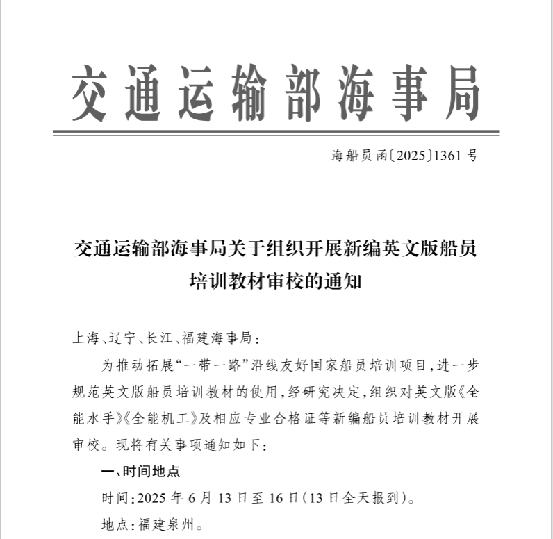 6月13日至16日,交通运输部海事局组织上海、辽宁、长江、福建等直属海事局、高等院校及行业专家对教材进行二轮审校,重点评估其科学性、规范性和前沿性。此次审校为教材最终获批奠定了基础,后续将由大连海事大学出版社正式出版。