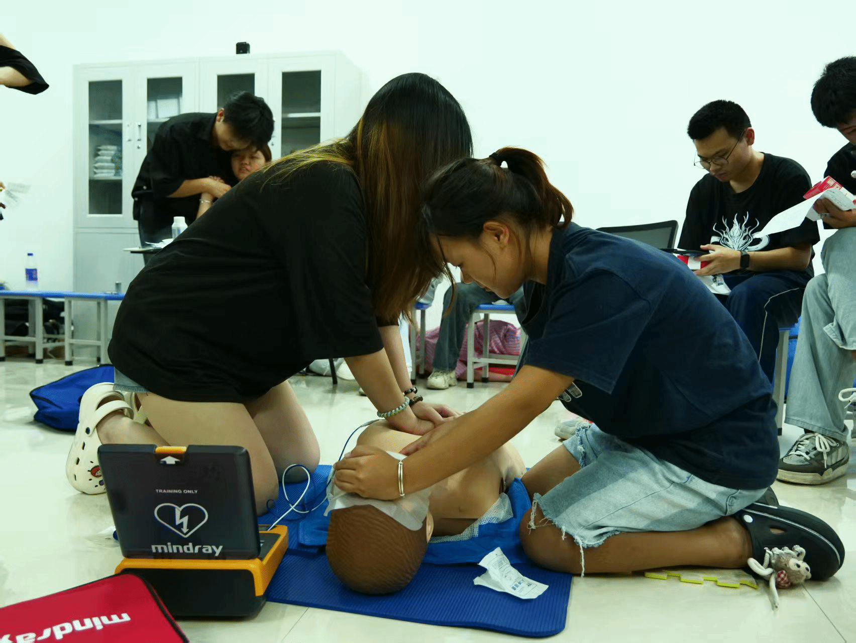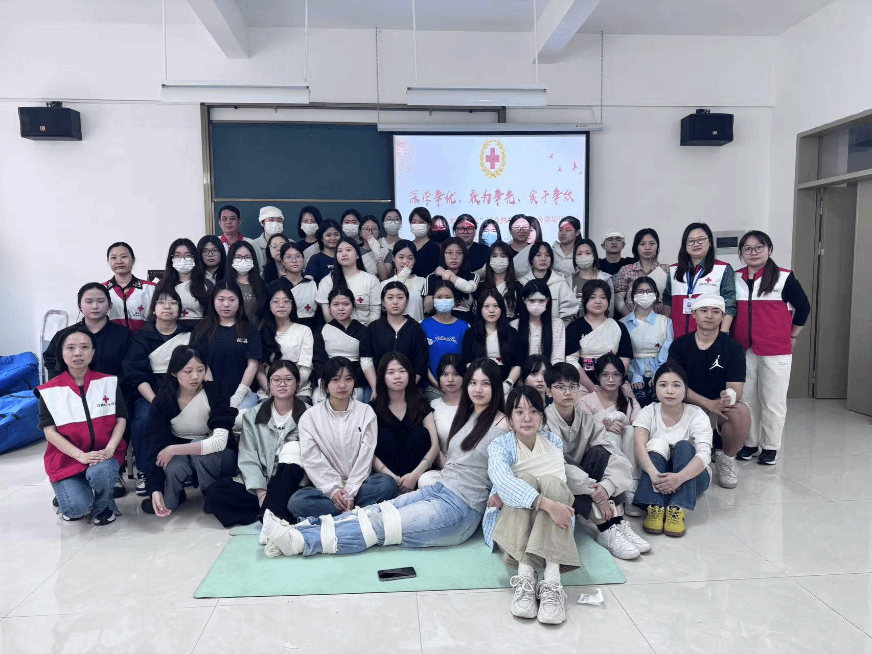 此次培训针对不同岗位职能与应急需求,将学工队伍全体教师、护理专业学生、校院两级学生干部及部分宿舍长划分为三大核心群体实施差异化培养。作为校园急救核心力量,学工队伍全体教师与护理专业学生重点学习心肺复苏、创伤救护等标准化技术,为后续校园培训储备专业力量;校院两级学生干部则聚焦“校园应急事件处置”,在模拟活动现场组织、伤员转运协调等实操场景中强化统筹调度能力,确保突发事件时响应有序;宿舍长作为寝室安全责任人,着重掌握止血包扎、气道异物处理等基础技能,着力打造“寝室有急救员、楼层有响应点”的微单元立体式防护体系,织密校园安全防护网。