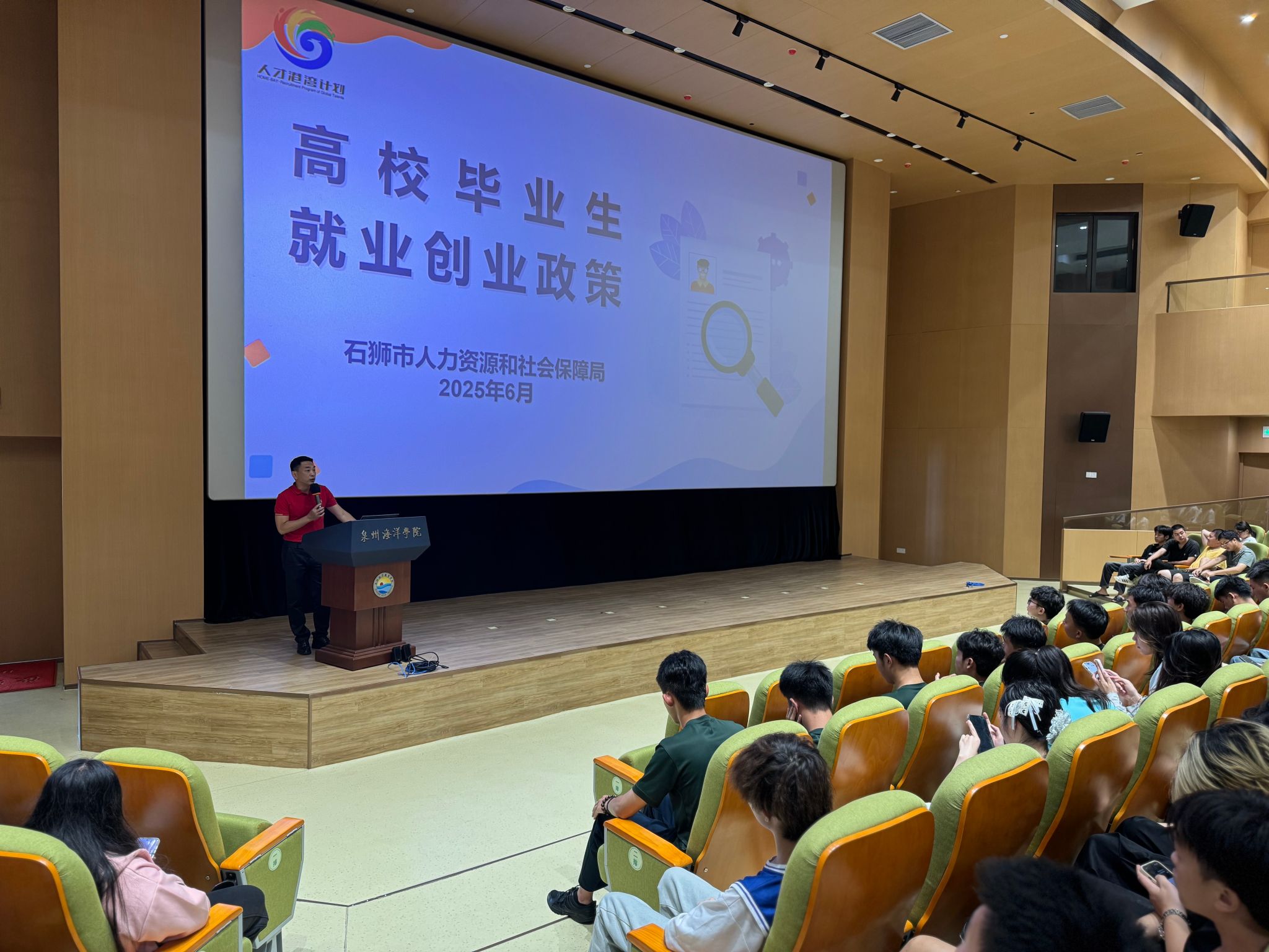本次企业宣讲及就业创业政策宣讲会在图书馆二楼学术报告厅举行。福建九龙水镇施柏阁度假村、中科光芯、华联等5家涵盖多领域的优秀企业代表,详细介绍企业概况、岗位需求与职业前景;石狮市人力资源和社会保障局及社保中心工作人员,同步解读高校毕业生就业创业、职工基本保险政策,政企联动为毕业生搭建起就业创业双向沟通桥梁,助力明晰职业规划,提升就业质效,吸引人才扎根石狮,为地方经济发展注入新动能,会后毕业生与企业、人社人员积极互动,活动成效显著。
