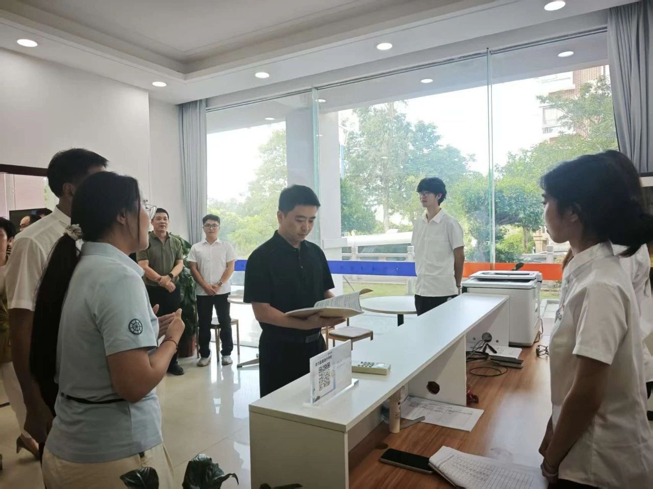 当天,余志伟市长、黄明瑄副市长、郑艳书记、庄伟廉校长共同为泉州海洋职业学院“家门口”就业服务站揭牌。未来,该就业服务站将以校园为阵地,创新构建政策咨询、岗位推介、职业指导“三位一体”的全链条服务体系,为毕业生们搭建起便捷高效的就业服务平台。走进就业服务站,领导一行与正在接受求职指导的毕业生们亲切交谈,仔细询问他们的专业方向、就业意愿、薪酬要求等具体情况,鼓励毕业生们立足专业特长,施展才华、追求梦想。