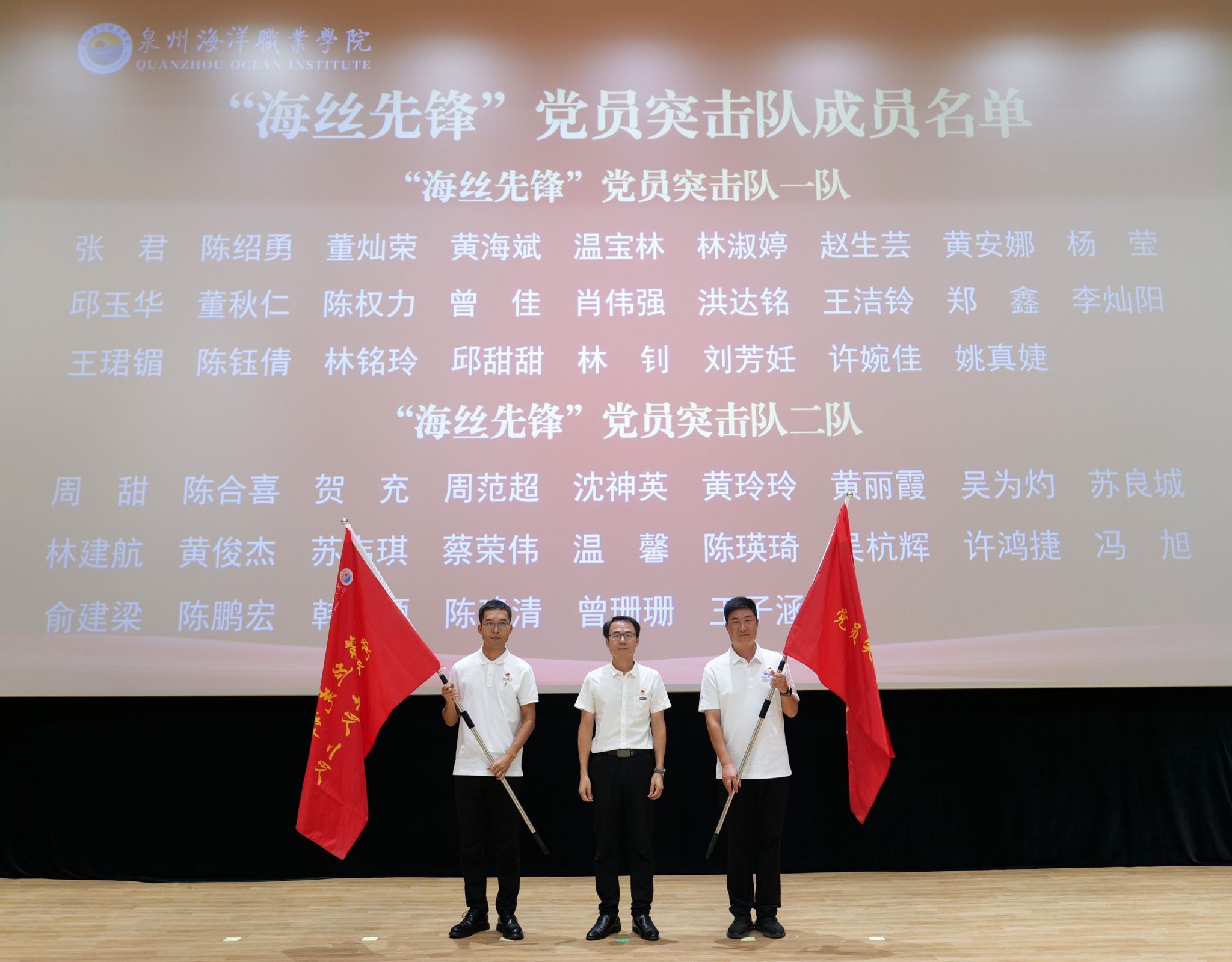 党委副书记、副校长李明灿为“海丝先锋”党员突击队一队队长张君、二队队长周甜授旗,激励队伍在服务发展中勇当先锋。
