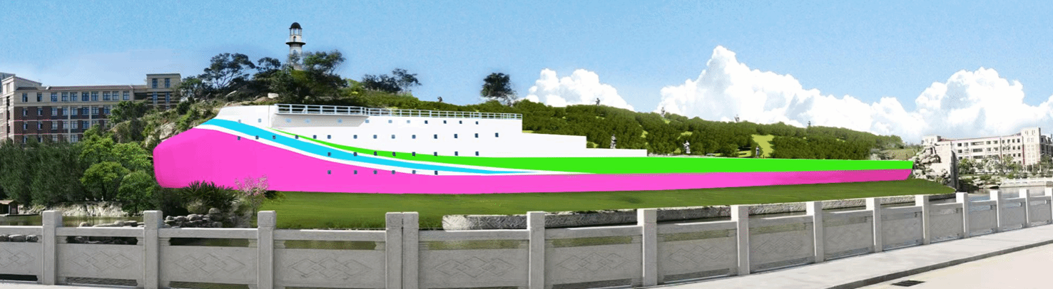在基地设计前期,董事会敏锐捕捉到原自然山体与船体造型相似的特征,提出依托自然山体现状形态,构建生态与人文和谐共生景观的设计思路。为使该景观设计深度契合学校文化内涵与师生审美需求,学校面向全体教职工广泛征集意见,最终敲定以“探索三号”科考船为原型进行景观打造。