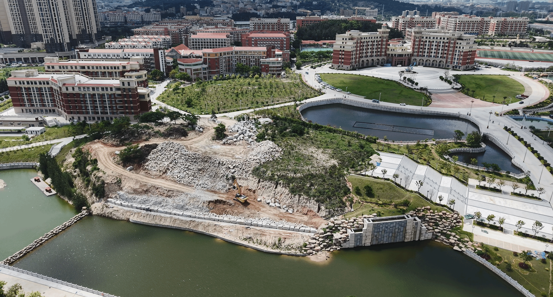 “探索三号”科考船景观前期设计采用无人机三维扫描技术对山体构造和山型进行全方位扫描收集数据﹑结合山体构造与船型三维模型,确定了船的大小及最佳船型位置,以确保施工过程中对山体的破坏程度最小化。船身部分就地取材,使用学校基建时从教学实验1#楼地下室开采的巨型石料,根据前期设计的“探索三号”三维模型依山势走向堆砌而成,有效的和学校已建的景观瀑布融为一体。为真实还原“探索三号”船头部分,设计团队根据“探索三号”三维模型依山型进行混凝土框架内结构设计,外型剪力墙则采用3D打印内外模板的技术形式进行加固,并通过人工绑扎钢筋后浇筑混凝土的施工方式,确保探索三号外型准确无误。