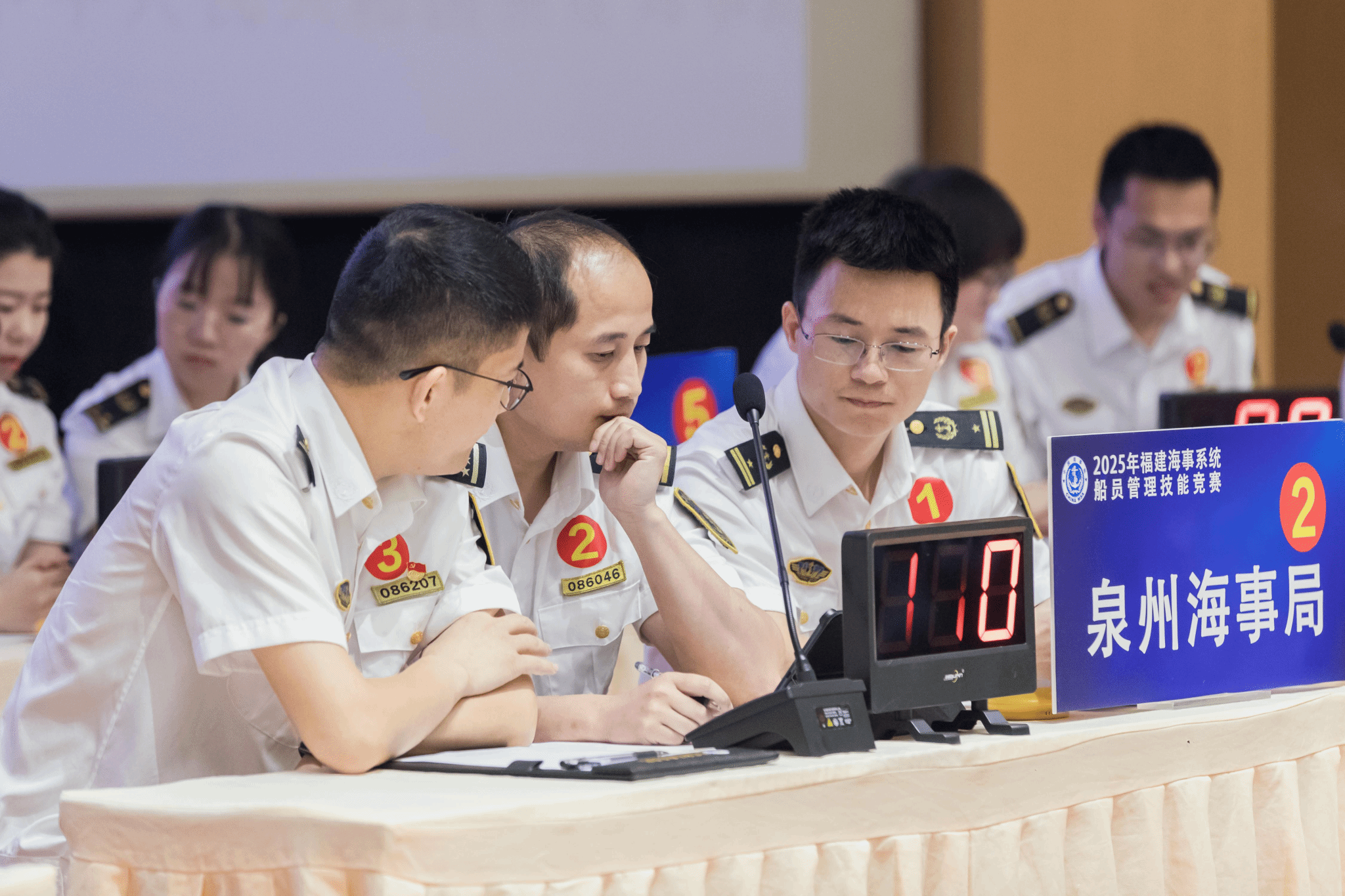 现场竞答环节精彩纷呈,包含队伍风采展示、必答题、抢答题和风险题四部分,在理论测试基础上,更注重考验选手的临场应变、团队协作及船员管理“服务为民”的实践意识与能力。