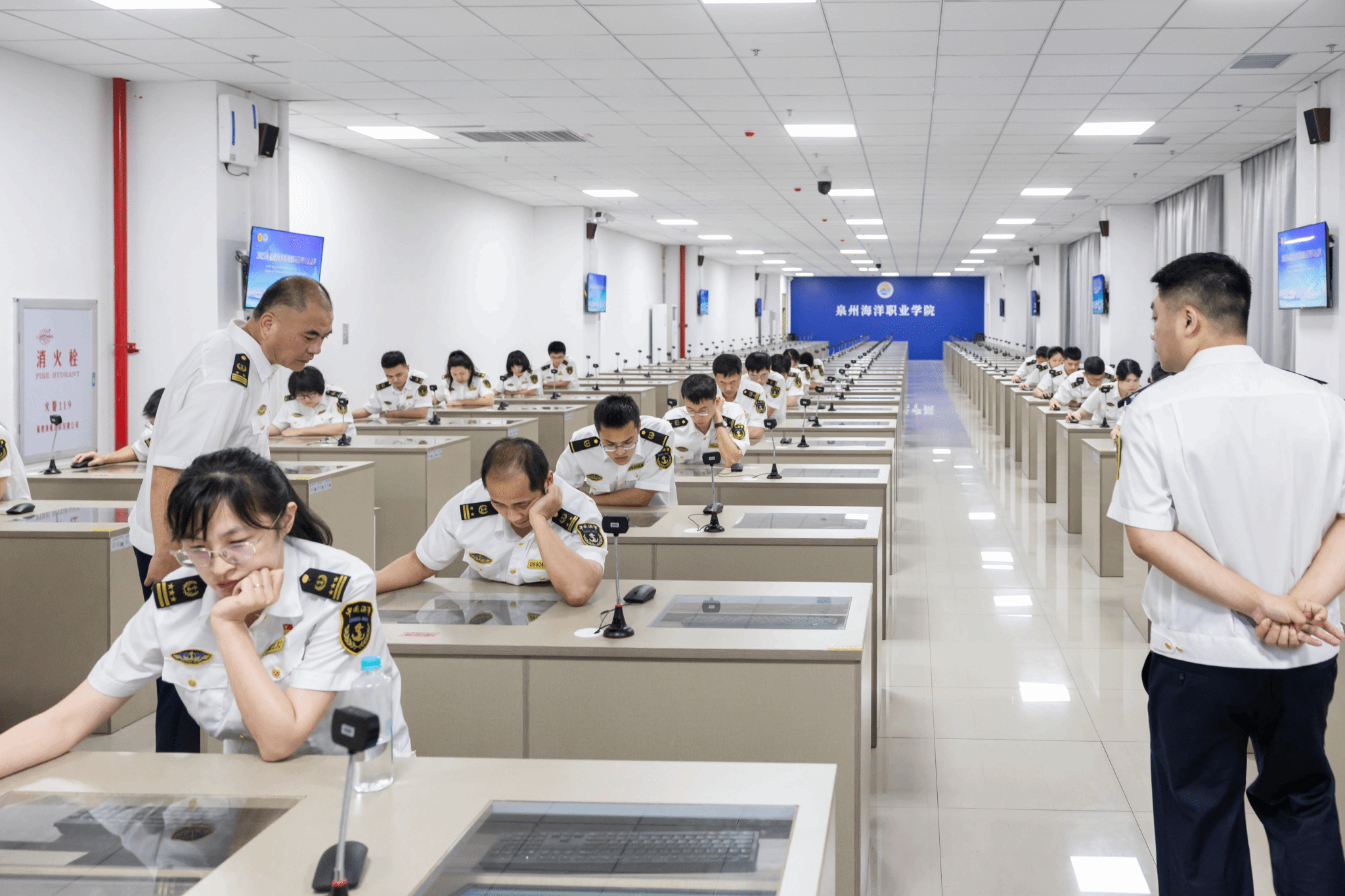 此次竞赛设置理论测试与现场竞答两大板块。理论测试在我校船员适任考试智慧考场举行,内容涵盖《1978年海员培训、发证和值班标准国际公约》(STCW)及其修正案、《2006年海事劳工公约》(MLC)及其修正案、《海上交通安全法》《船员条例》及船员管理相关法规规章等,着重考察选手对海事行政执法基础理论及船员管理专业知识的掌握深度。