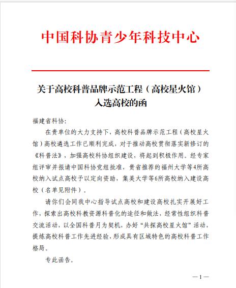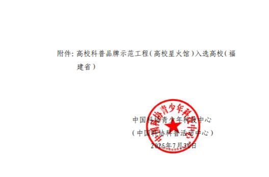 (新闻中心讯 科技处供稿 党委宣传部报道)近日,中国科协组织实施的高校科普品牌示范工程(高校星火馆)评选结果揭晓,泉州海洋职业学院凭借在科普工作领域的突出成效与特色优势,成功入选项目建设高校!这是对我校长期致力于科普事业、服务社会公众的高度认可。
