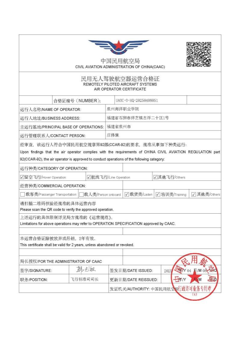 作为福建省职业教育创新发展的排头兵,泉州海洋职业学院前瞻布局低空经济领域。学校不仅率先开设无人机应用技术专业,构建了包含模拟飞行、组装调试、航拍测绘、植保作业、航模开发及飞行实操等在内的完整课程体系,更于2022年10月成立无人机社团,创新打造“政-校-企”协同育人模式。该社团搭建“活动+培训+就业”一体化平台,通过订单式培养和参与影视航拍、智慧巡检等真实项目,显著提升了学生的实践能力与就业竞争力。无人机社团项目《“科创赋能·职通未来”高校无人机低空经济领航者》在2025年福建省高校“科技创新类”社团精品项目评选中荣获全省唯一特等奖,充分彰显了建设成效。今年4月,学校成功获批中国民航局颁发的《民用无人驾驶航空器运营合格证》和《民用无人机驾驶员训练机构合格证》,成为福建省内少数具备无人机领域全链条资质的高职院校。这两项权威资质,是对学校教学与培训能力的官方认可,为深化人才培养奠定了坚实基础。