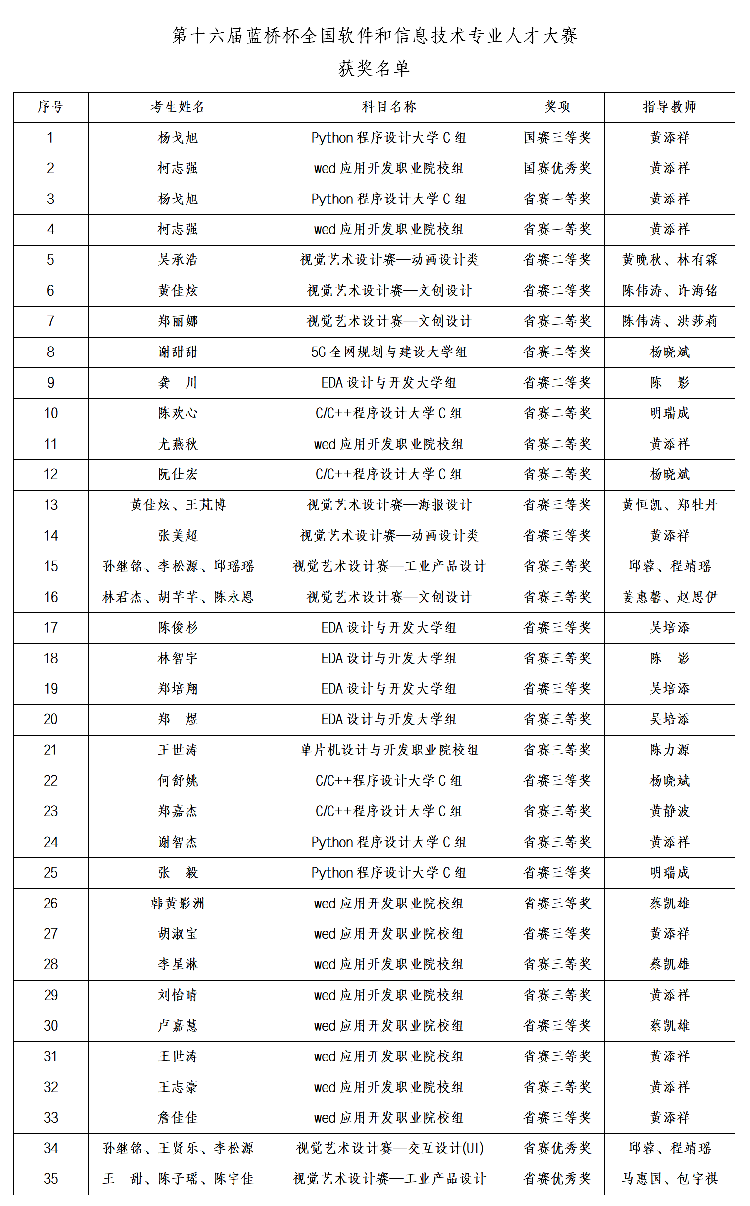 (新闻中心讯 信息工程学院供稿 党委宣传部报道)近日,由工业和信息化部人才交流中心主办的第十六届“蓝桥杯”全国软件和信息技术专业人才大赛落下帷幕。我校信息工程学院学子表现突出,最终斩获国家级三等奖1项、优秀奖1项;省级一等奖2项、二等奖9项、三等奖25项,获奖数量创历史新高,充分展现了学校扎实的专业人才培养水平和学生优秀的实践创新能力。