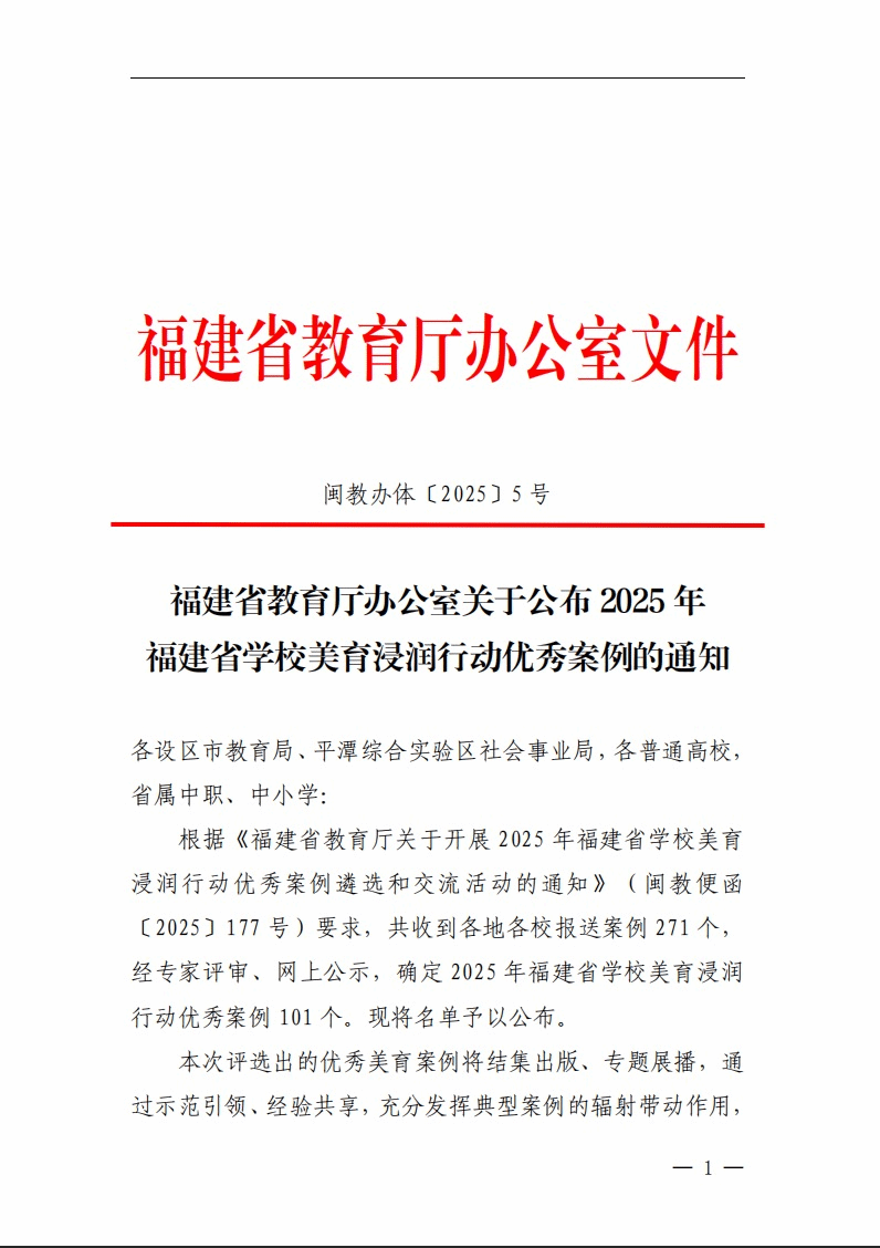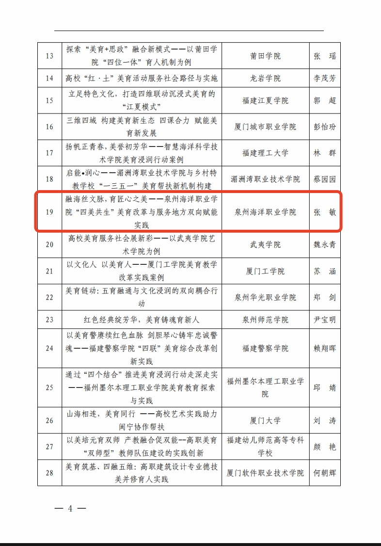 (新闻中心讯 教务处供稿 党委宣传部报道)日前,福建省教育厅公布了2025年福建省学校美育浸润行动优秀案例名单。我校申报的《融海丝文脉,育匠心之美——泉州海洋职业学院“四美共生”美育改革与服务地方双向赋能实践》案例成功入选,充分展现了我校在美育改革创新方面的实践成效。