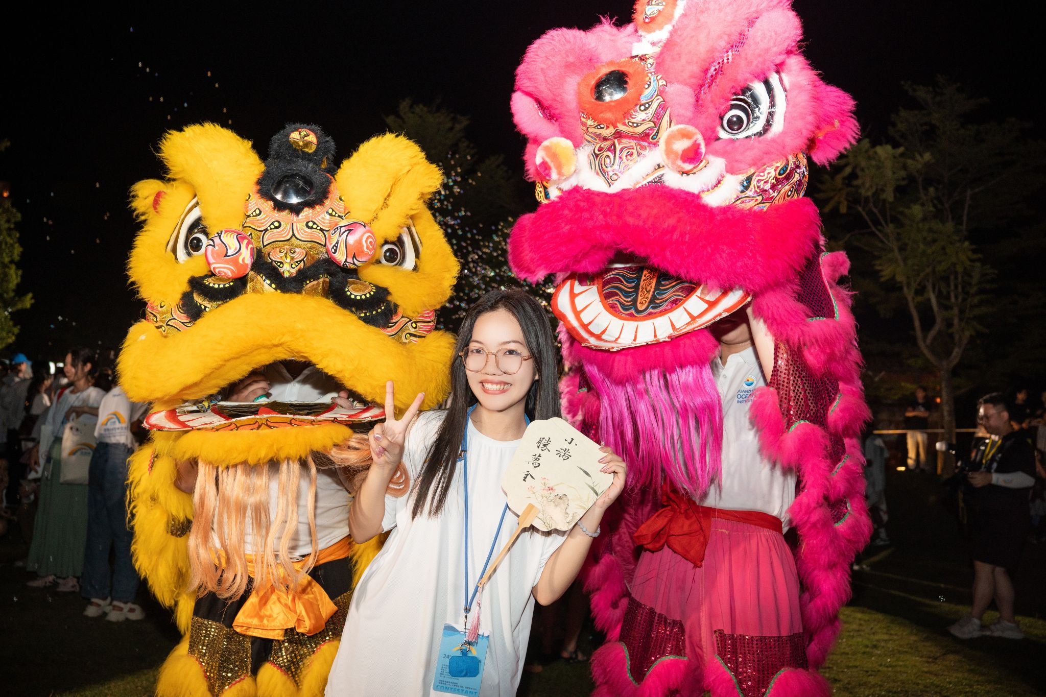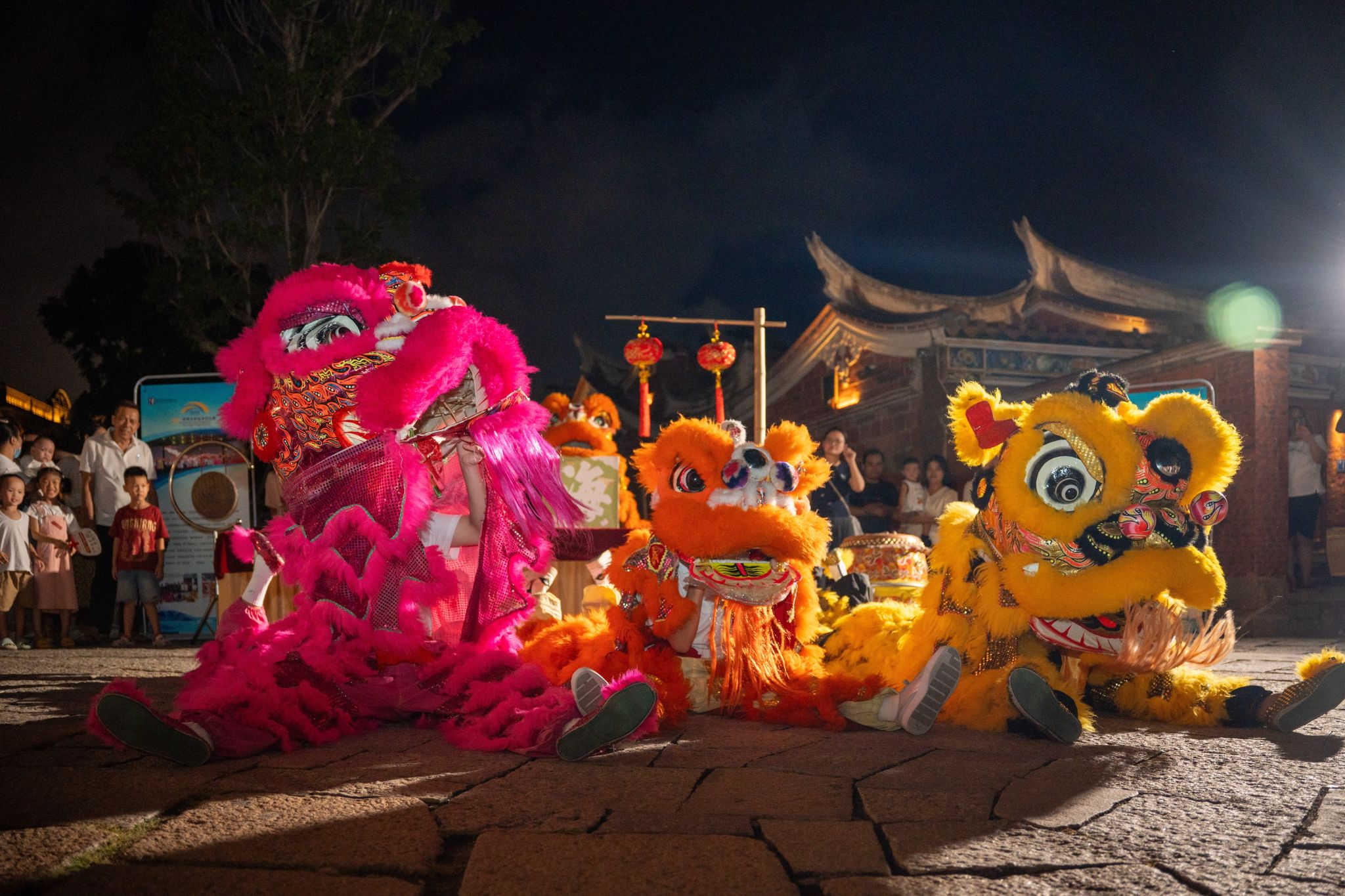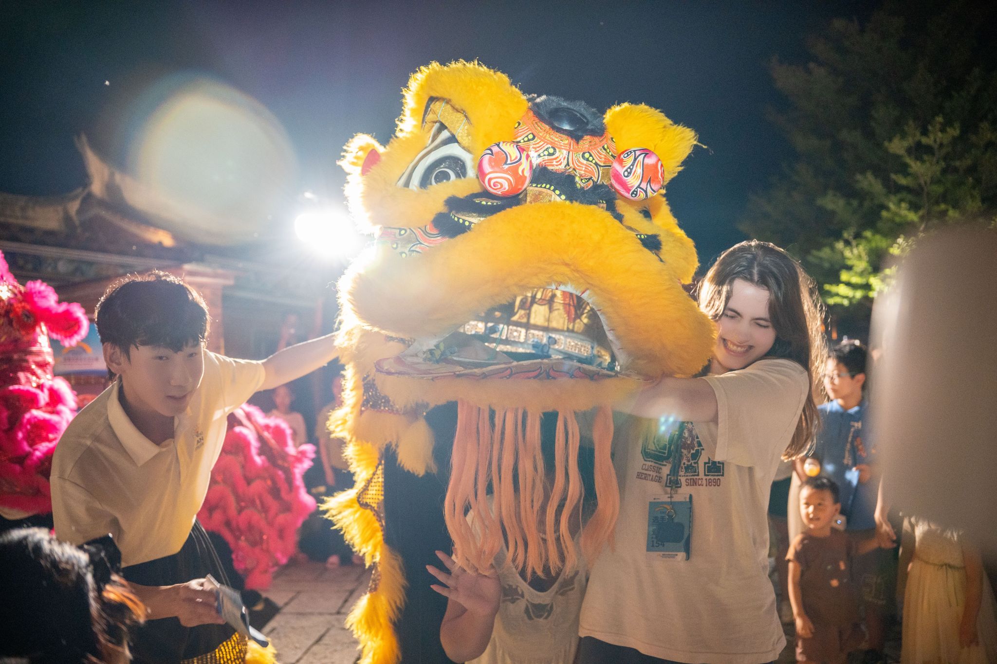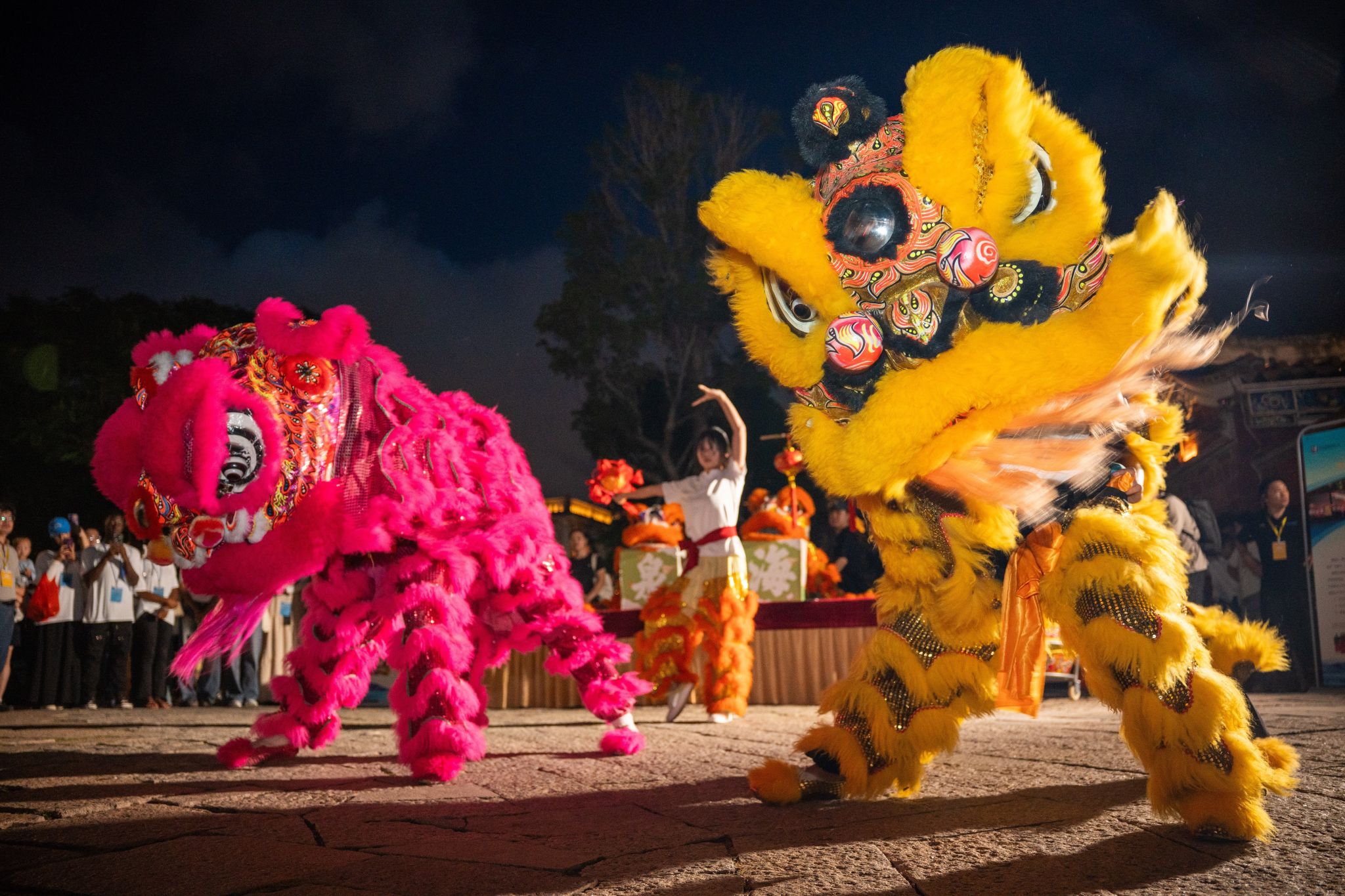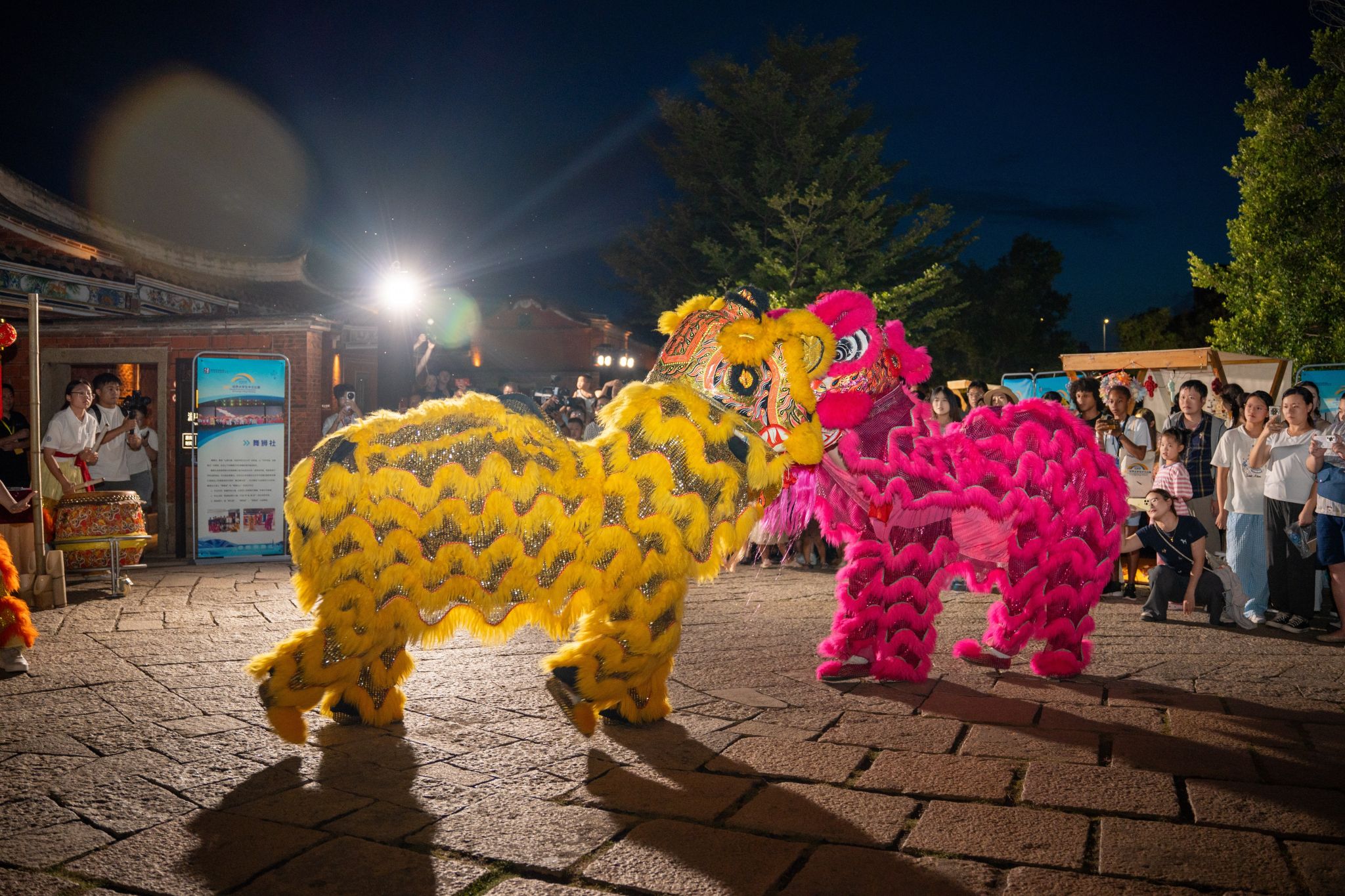 当日的梧林古厝红砖赤瓦错落,大红灯笼沿巷高悬,处处洋溢着热闹氛围。我校舞狮社成员庄佳兴、陈佳骏、吴宏骏、游鹍凌身着狮袍闪亮登场,引狮人文其淇手持绣球灵巧引领。伴随着队员杨庭南敲响的铿锵锣鼓划破暮色,各国选手与游客纷纷驻足,数百双眼睛里跃动着好奇与惊叹。两头威风凛凛的“雄狮”踏着明快鼓点,在古厝广场上灵活游走。