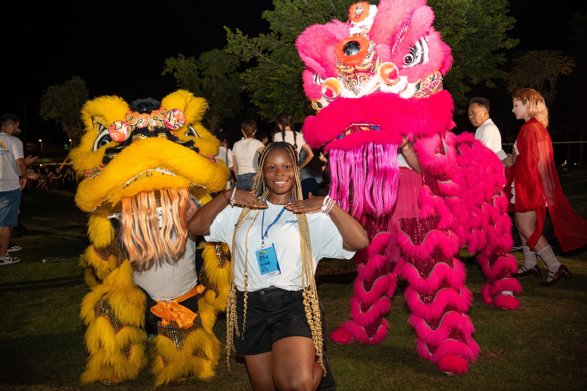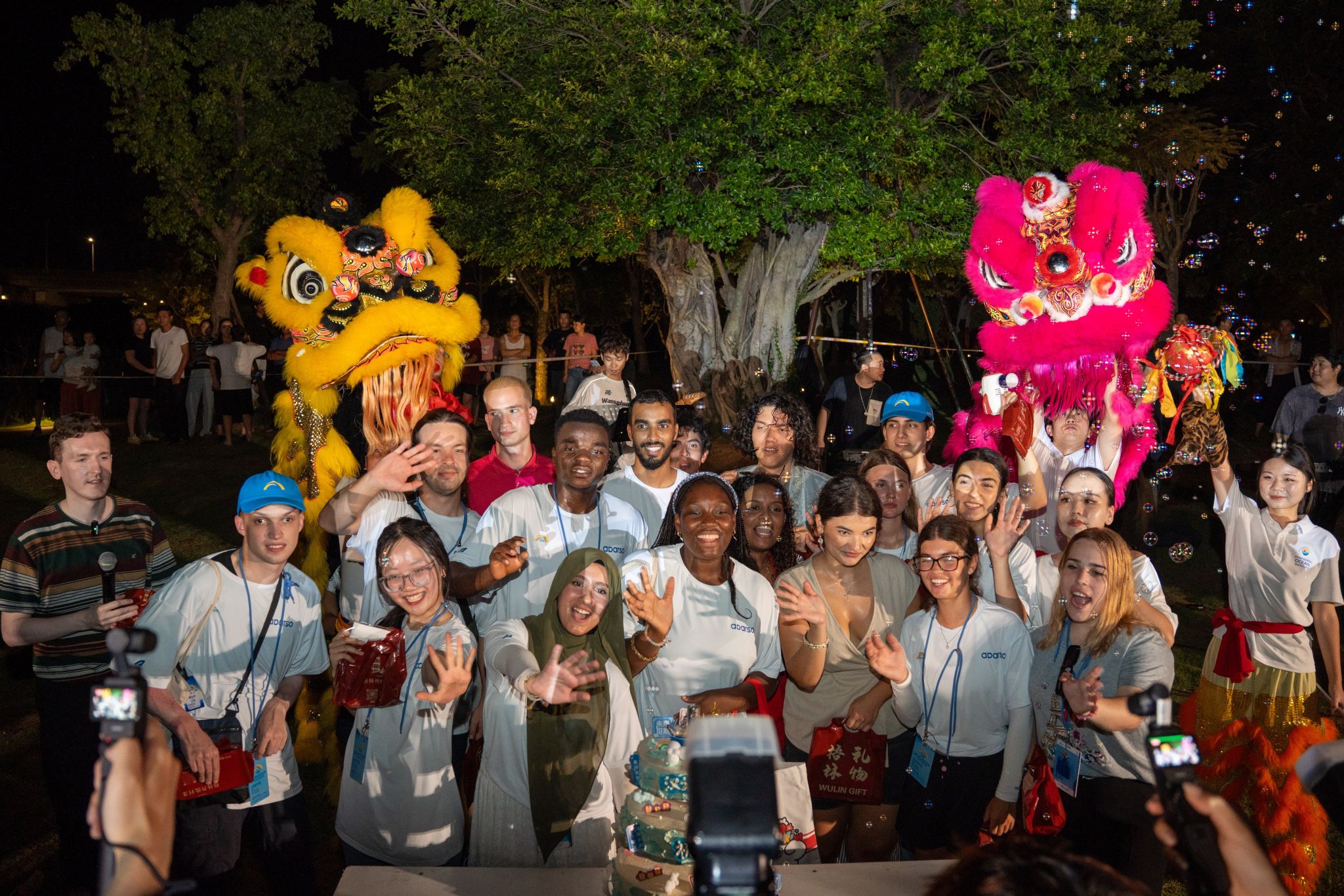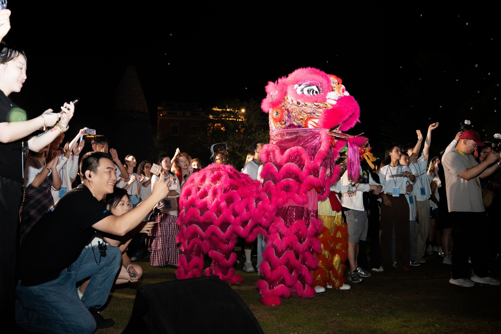 表演结束后,舞狮社成员还参与了草地音乐会。主办方特意为19位外籍选手筹备了一场别开生面的生日会。舞狮队员与参赛选手们随着节奏即兴共舞、齐唱《生日歌》。外国选手们纷纷用手机记录下醒狮的精彩瞬间。