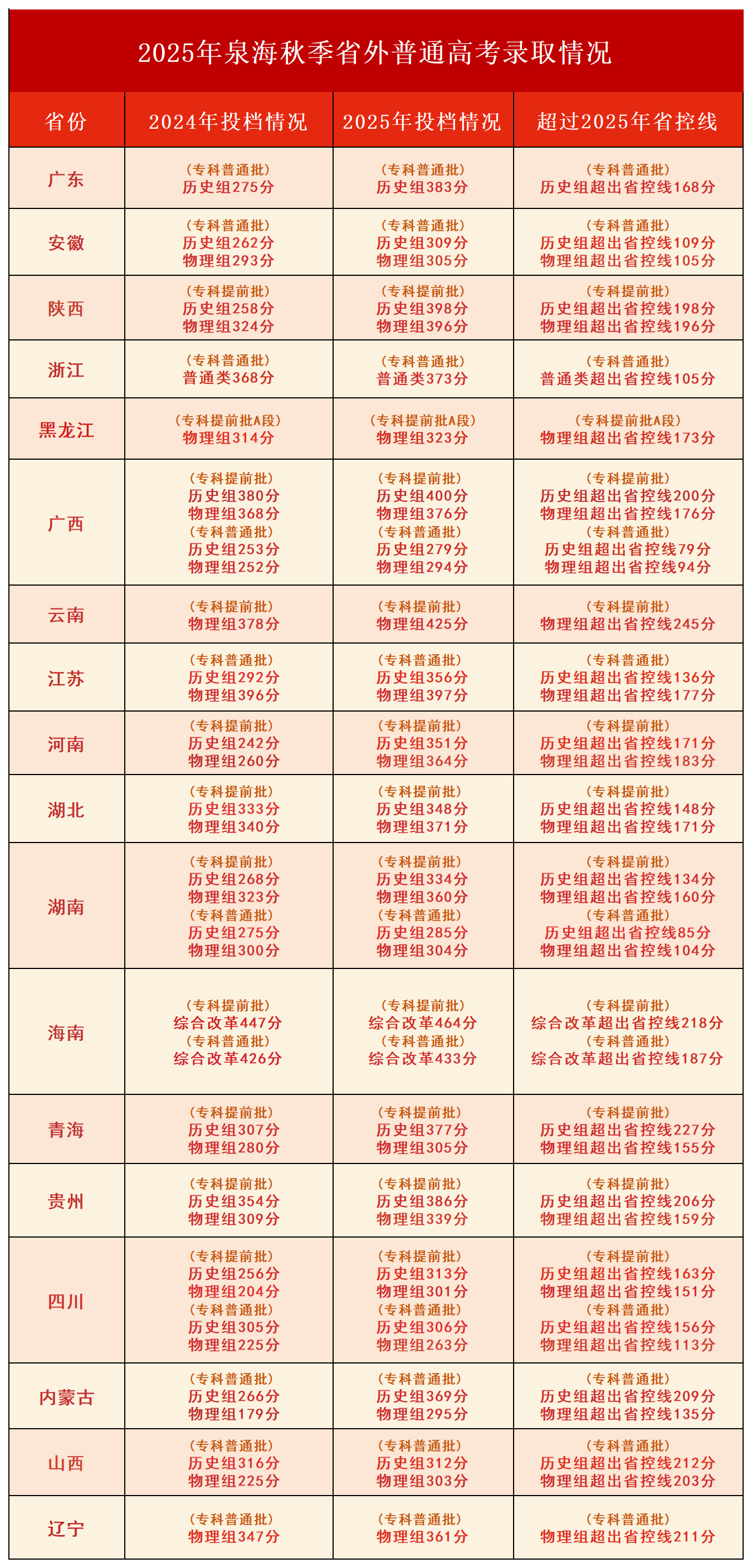 省外招生录取同样表现亮眼,多省份录取分数显著提高,生源质量较往年进一步提升。据统计,八成省份录取分数线超省控线100分以上,考生报考热情持续高涨。在满档的省份中,多个省份分类别投档分数同比提升,学校吸引力与品牌影响力持续增强,招生工作步入“质量与规模双提升” 的良性循环。
