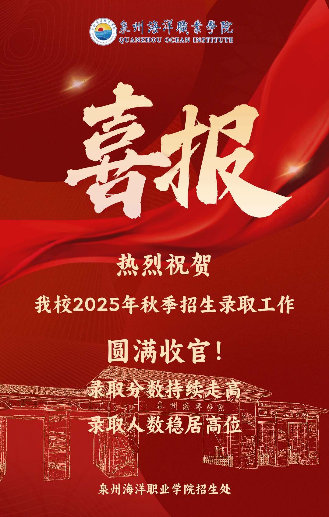 (新闻中心讯 招生处供稿 党委宣传部报道)近日,我校2025年秋季全国各省份招生录取工作正式落下帷幕。历经 44 天的高效推进,学校面向全国25个省(自治区、直辖市)招生,招生录取工作捷报频传,不仅实现整体生源数量充足,分专业、分类别投档分数线与生源质量更是显著提升,在省内同类院校中持续名列前茅。2025年招生录取工作圆满完成。