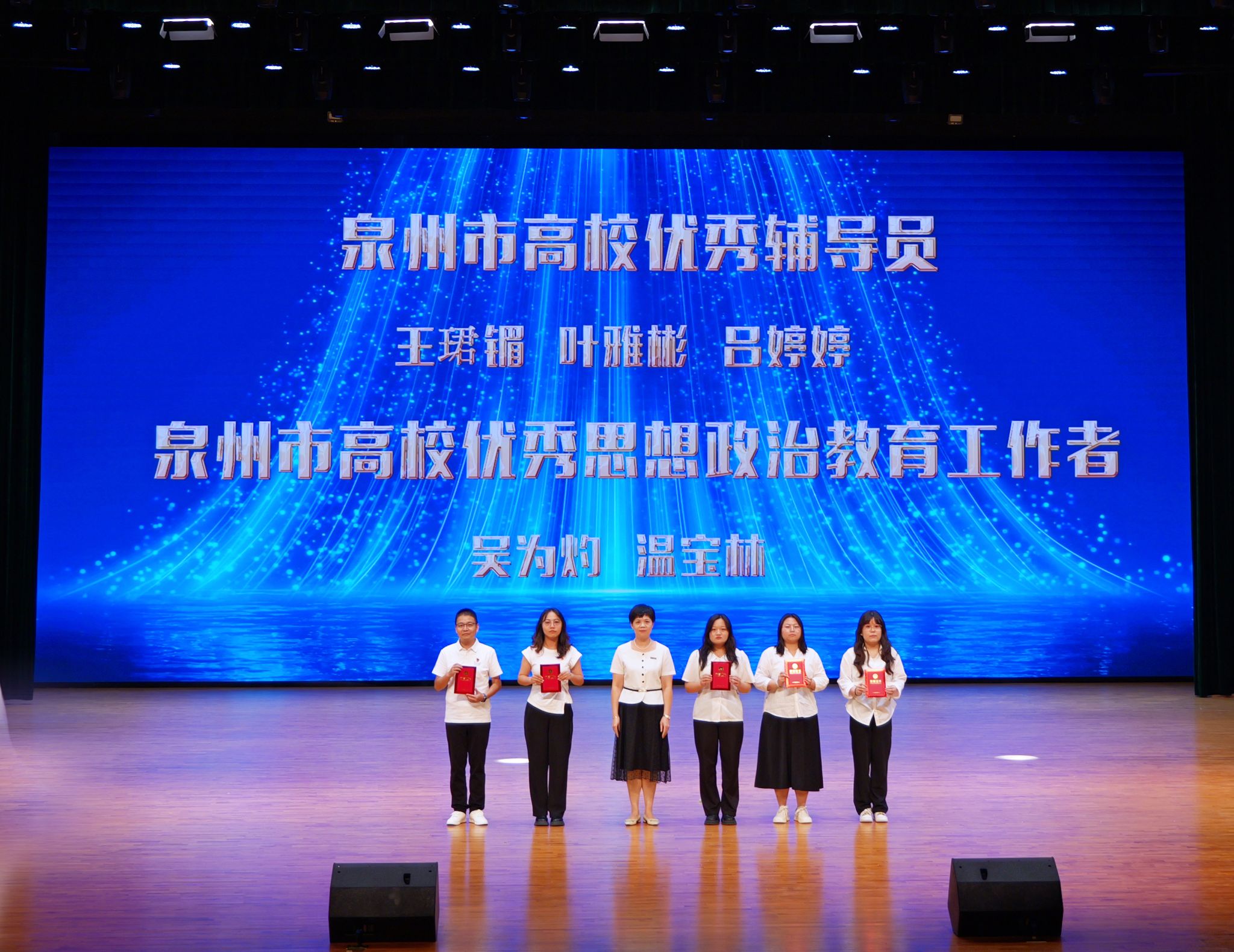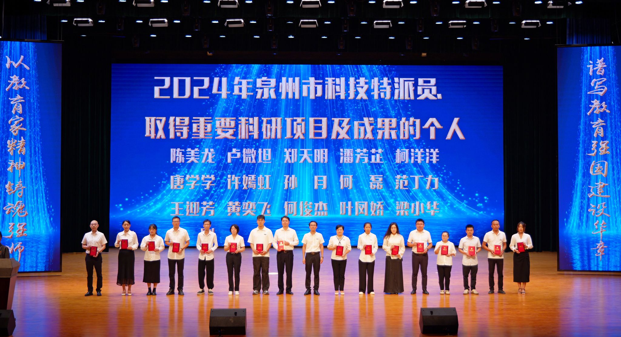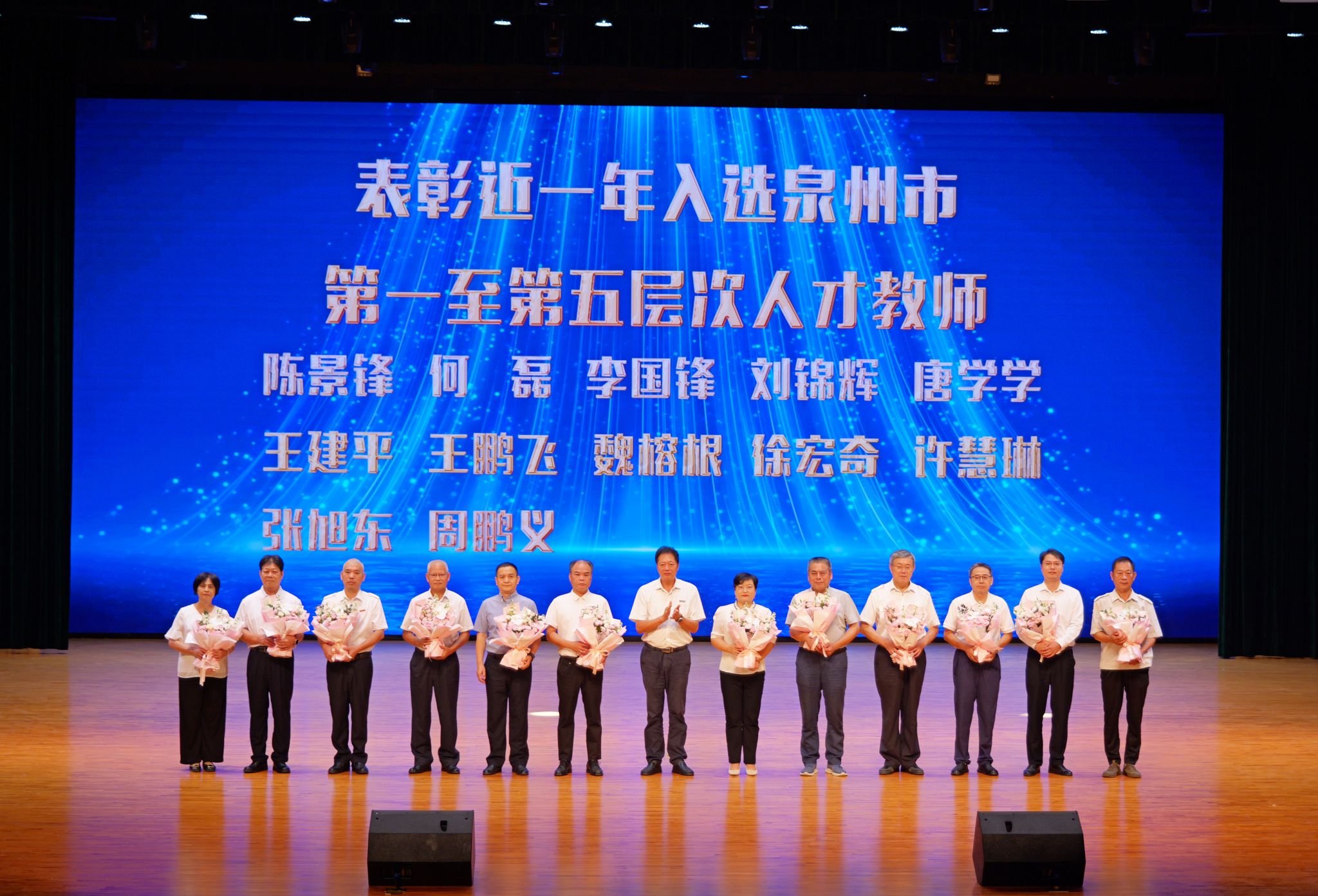 校长庄伟廉宣读优秀教师、优秀教育工作者、泉州市高校优秀辅导员、泉州市高校优秀思想政治教育工作者、入选2025年泉州市第一至第五层次人才教师的表彰决定。获奖教师依次上台接受荣誉,现场掌声不断,气氛隆重热烈。