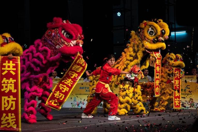 表演的高潮在最后时刻到来——绣球高高抛起,鼓点骤然加快,紫湖小学的两只“小狮子”与我校的两只“大狮子”齐齐登场,四只“狮子”围绕绣球灵活跳跃、追逐嬉戏,时而并肩腾跃,时而错落摆阵,与巨龙呼应,将现场气氛推向顶点。此次表演,充分展现了我校学生社团的蓬勃活力,也为这场聚焦食品安全与营养健康的竞赛注入了别样的文化动力。