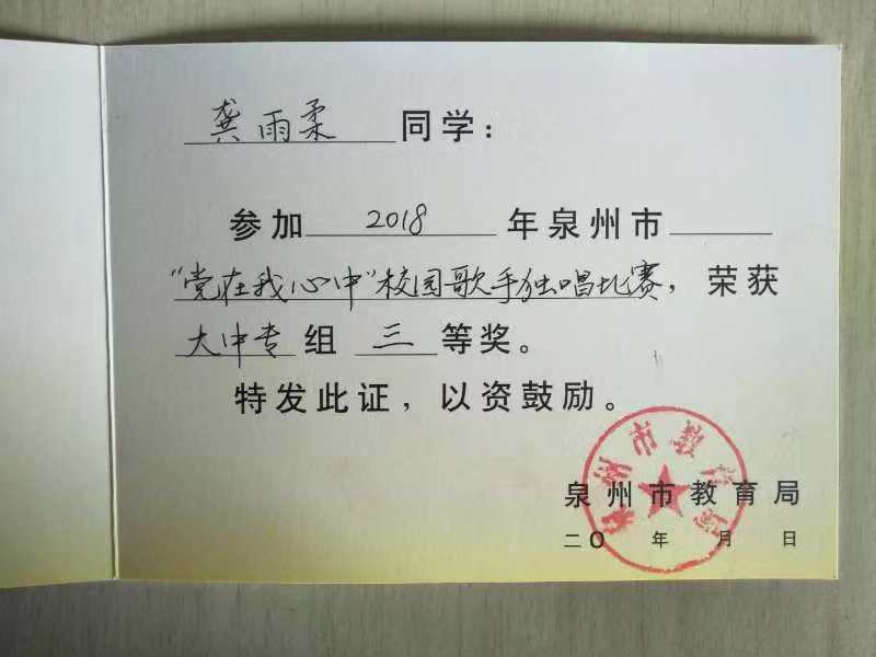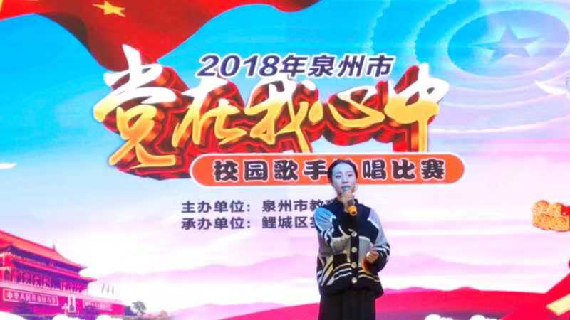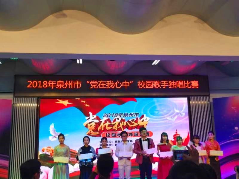 新闻中心讯(团委供稿 党政办编辑)12月14日下午2时,泉州市教育局主办的“党在我心中”校园歌手独唱比赛在鲤城区实验小学4楼会议室拉开了帷幕。来参赛的大中专学校共有28所,我校选手代表是来自17级表演艺术1班的龚雨柔同学,她歌唱的曲目是《共产党颂》,经过激烈角逐,通过7位专业评委老师的综合评定,我校龚雨柔同学荣获第三名的佳绩。
