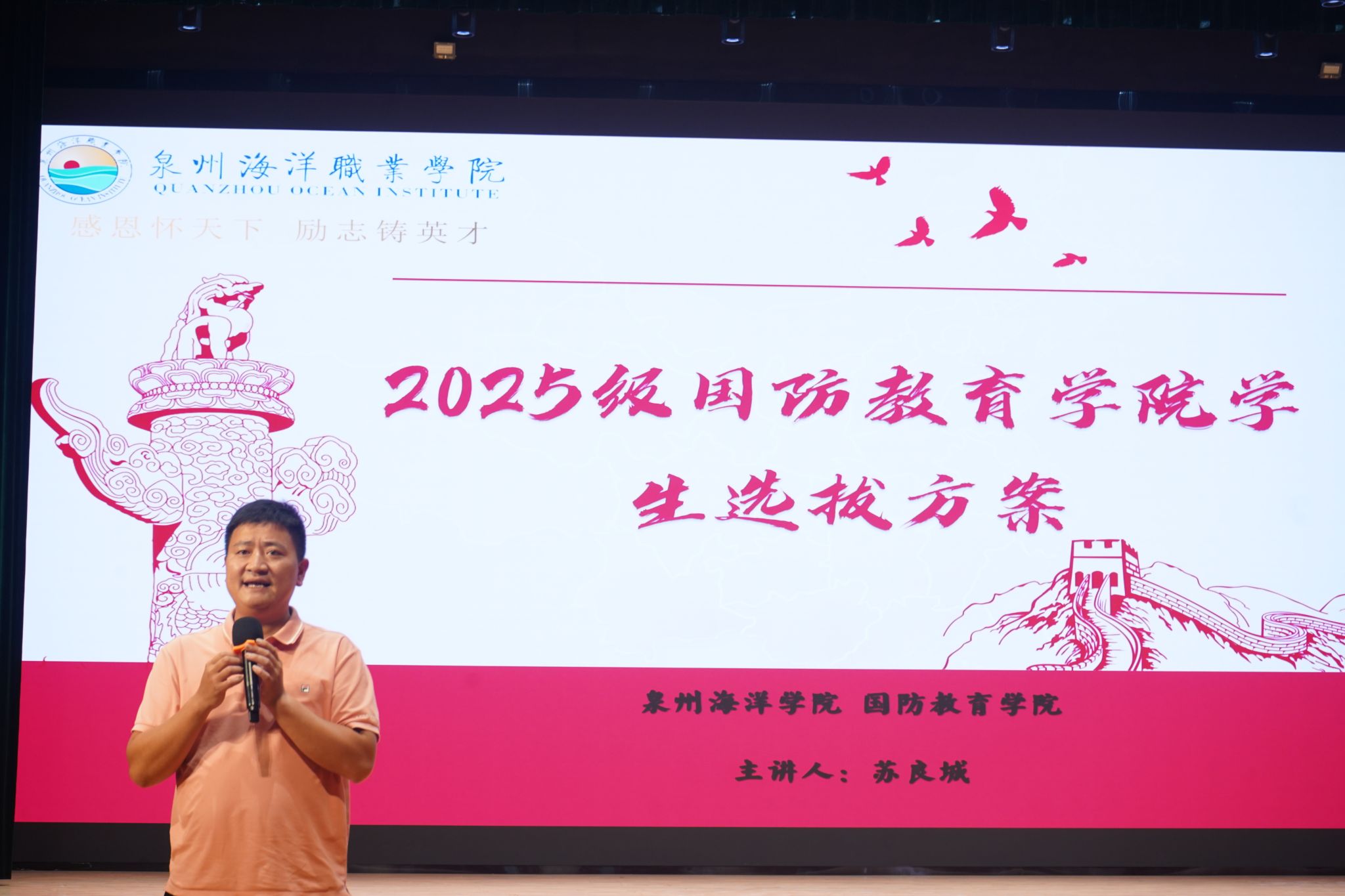 强化宣传引导,点燃报国热情。国防教育学院以全民国防教育日精神感召和秋季征兵工作推进为契机,将“投身国防、荣耀泉海”的理念融入宣传全过程。9月7日学校2025级新生报到结束后,国防教育学院就根据学校下发《2025级国防教育学院学生选拔方案》的通知精神,深入到相关二级学院,面向航海技术、轮机工程技术等六个专业新生开展“面对面”宣讲,详细介绍国防教育学院人才培养特色、选拔标准与就业方向,现场解答专业融合、军旅成长等热点问题,有效激发了新生的参与热情与荣誉感。