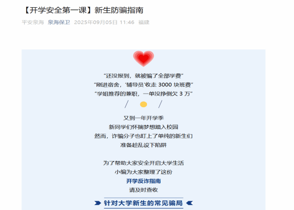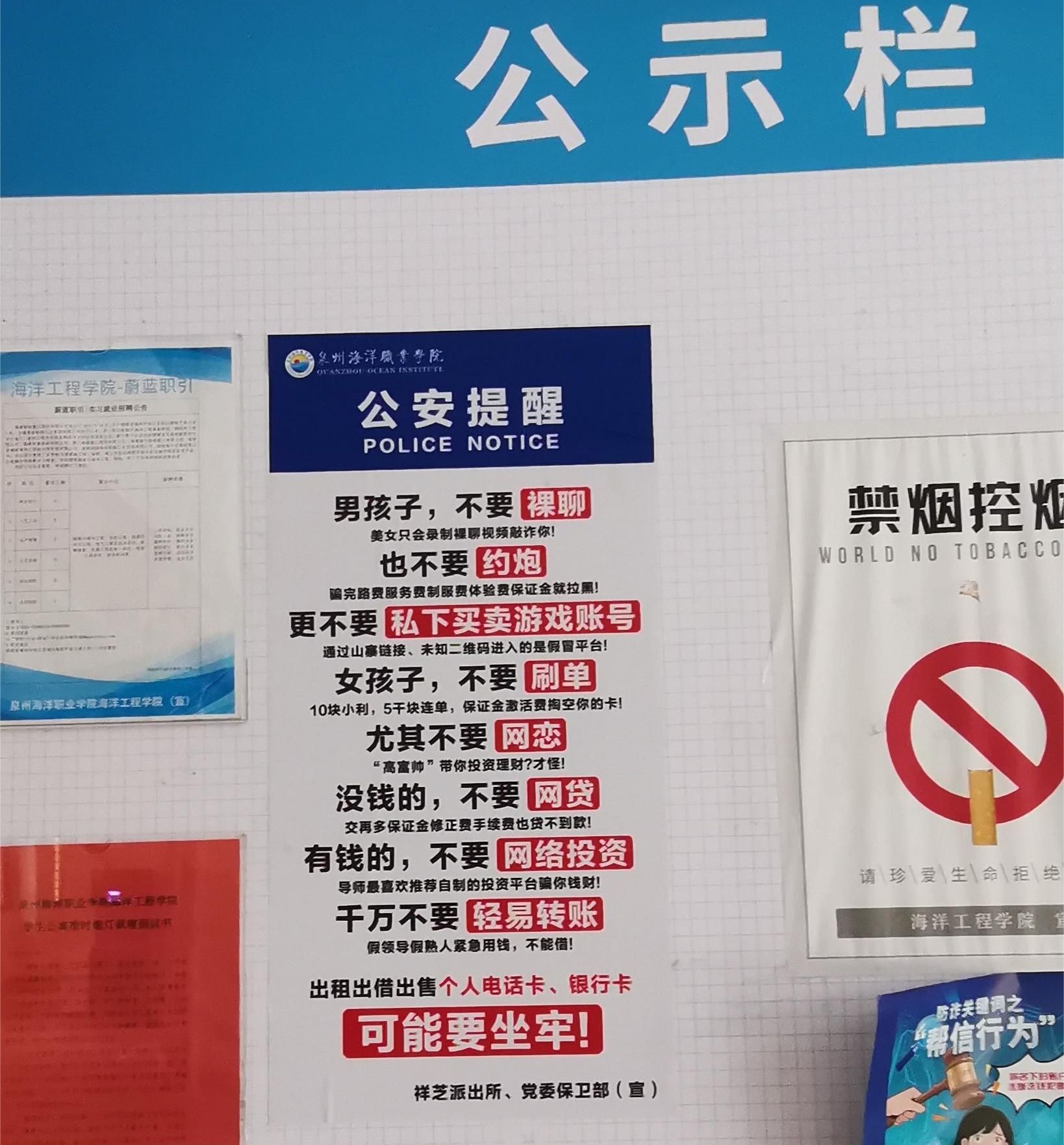 校园视觉宣传同步推进,针对大学生常见诈骗手法定制反诈标语和海报,在宿舍、食堂、教学楼等人流密集区广泛张贴,各场所LED屏持续滚动播放警示语,营造出“处处见反诈、时时提警惕”的浓厚氛围。此外,学校依托微信公众号、“智慧泉海”APP等平台推送反诈知识系列推文15篇,并向全体教职工发放《反诈信》,将防骗知识有机融入教育教学与管理服务各环节,构建线上线下联动、师生全员覆盖的宣传矩阵。