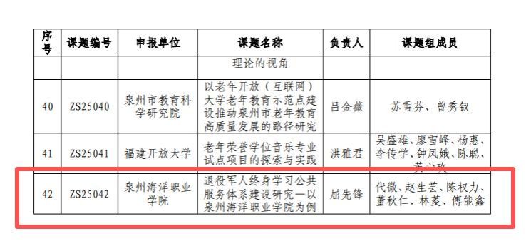 由继续教育学院屈先锋老师主持的课题《退役军人终身学习公共服务体系建设研究—以泉州海洋职业学院为例》,入选2025年省级终身教育一般课题。该课题围绕退役军人终身学习的实际需求,以学校退役军人教育服务实践为样本,系统探索退役军人终身学习公共服务体系的构建路径与实施机制。
