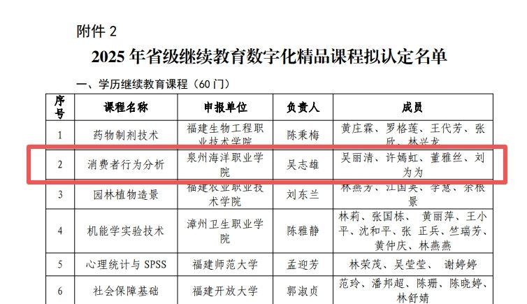 学校另有两门继续教育课程入选省级精品课程名单:经济管理学院吴志雄老师主持的《消费者行为分析》课程,以系统化的教学内容为基础,结合消费者行为领域的前沿理论与实践案例,运用数字化教学手段,构建了兼具理论深度与实践指导性的课程体系。信息工程学院郑文金老师主持的《网页设计与制作》课程,注重网页设计与制作的核心技能培养,通过数字化教学设计优化教学流程,融入项目式教学理念,有效提升了学员的实践操作能力与岗位适配能力。