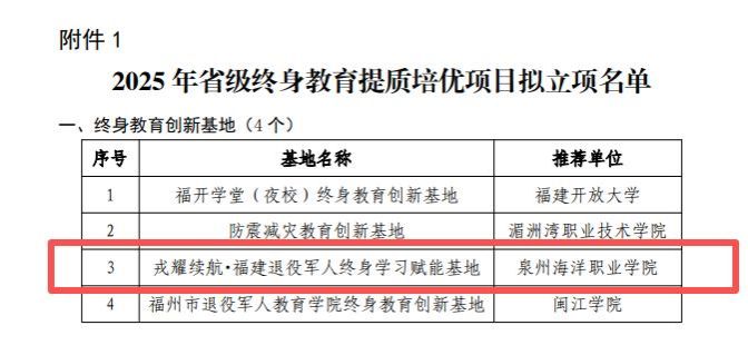 “戎耀续航・福建省退役军人终身学习赋能基地”凭借扎实的建设成果与创新实践,入选省级终身教育创新基地。该基地是本次所有入选主体中唯一一个依托民办高校设立的创新基地。