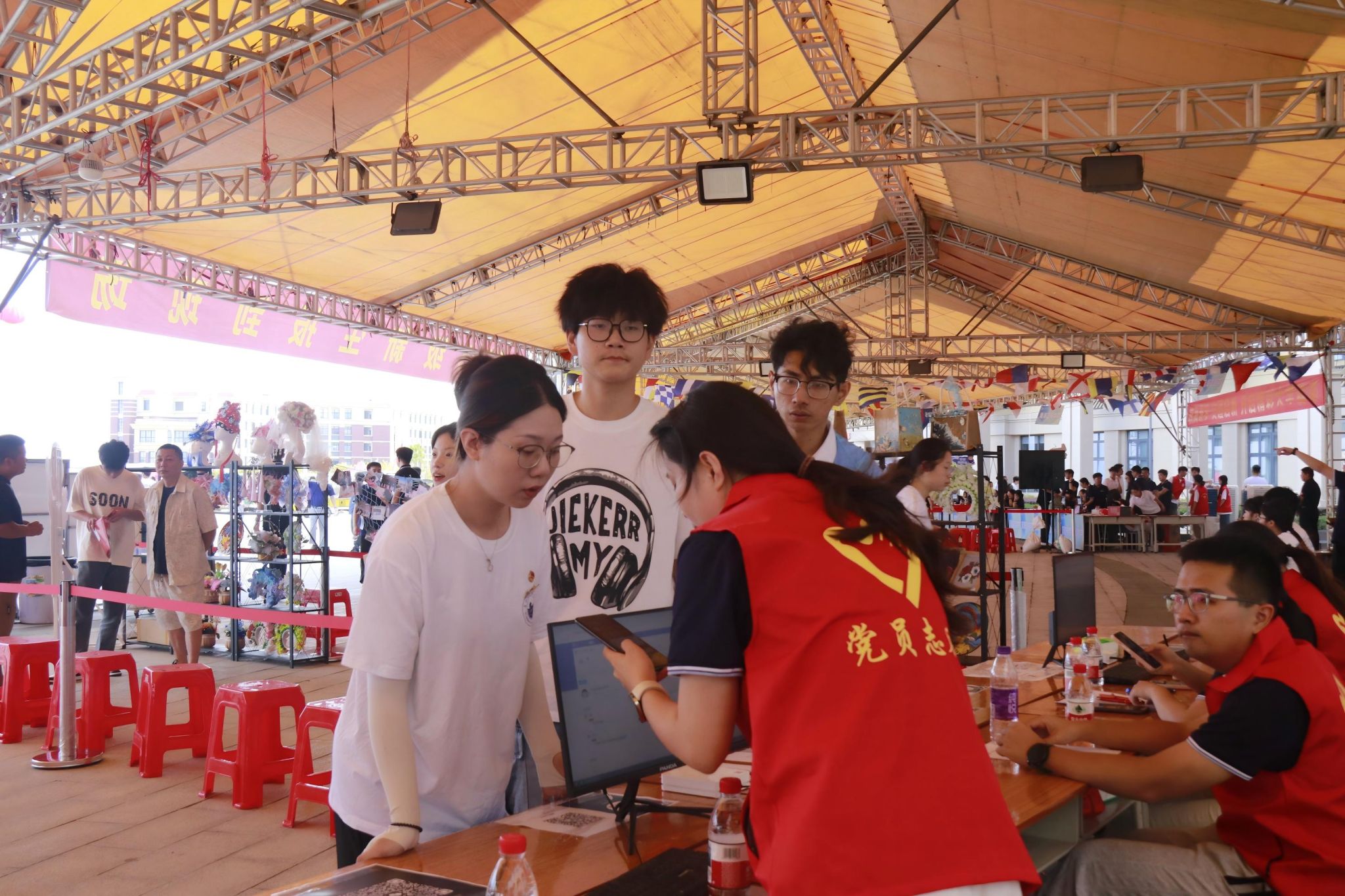 以新生报到为契机,充分发挥党员的先锋模范作用,校院两级同步设立“党员先锋岗”“党员服务站”,组建红色志愿服务队,提前布置现场、轮班值守宿舍,现场答疑引导、搬运行李、讲解流程,用一抹“党员红”点亮新生“第一盏引路灯”。