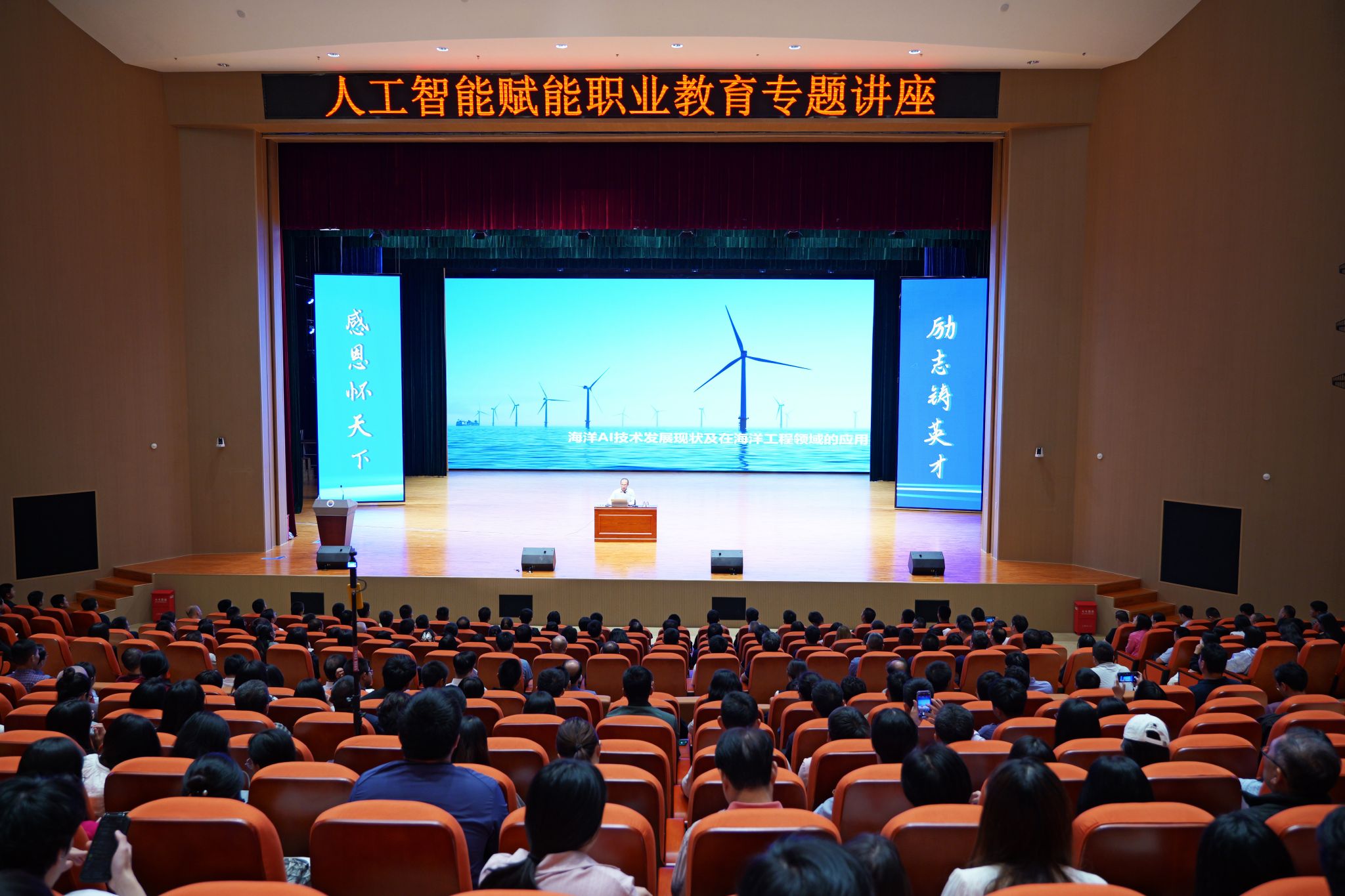 (新闻中心讯 党委宣传部报道)人工智能的浪潮正以前所未有的力量重塑着世界,也为职业教育的发展带来了新的机遇与挑战。为助力师生进一步把握海洋工程领域前沿趋势,探索数智时代的教育创新与产业变革,11月8日下午,学校举办2025年第4期泉海大讲堂——“人工智能赋能职业教育”专题讲座,带领师生领略高校管理的“内功心法”,感受人工智能在产业前沿的澎湃动力。蔡天真董事长、全体校领导、全体教职工及相关专业学生代表共1500人齐聚一堂,共赴这场思想盛宴。