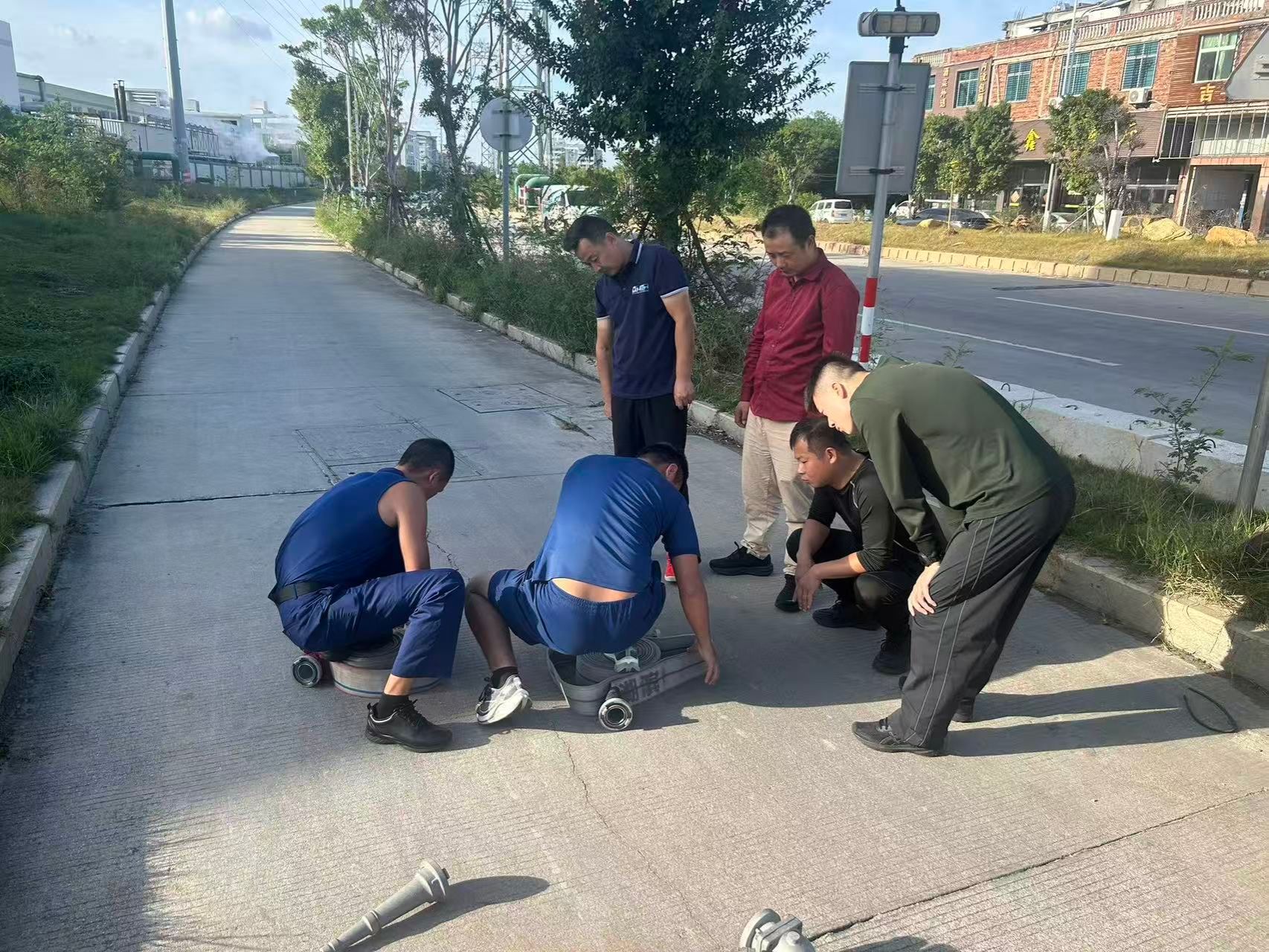 为积极备战,队伍克服时间紧、任务重的困难,利用休息时间在无人机培训基地规划出符合赛事要求的训练场地,开展针对性强化训练。同时,为确保动作规范、提升训练成效,队伍主动前往鸿山消防救援站寻求专业指导。训练期间,队员们刻苦投入,有效克服了大风、水带沉重等实际困难,为比赛中的稳定发挥奠定了坚实基础。