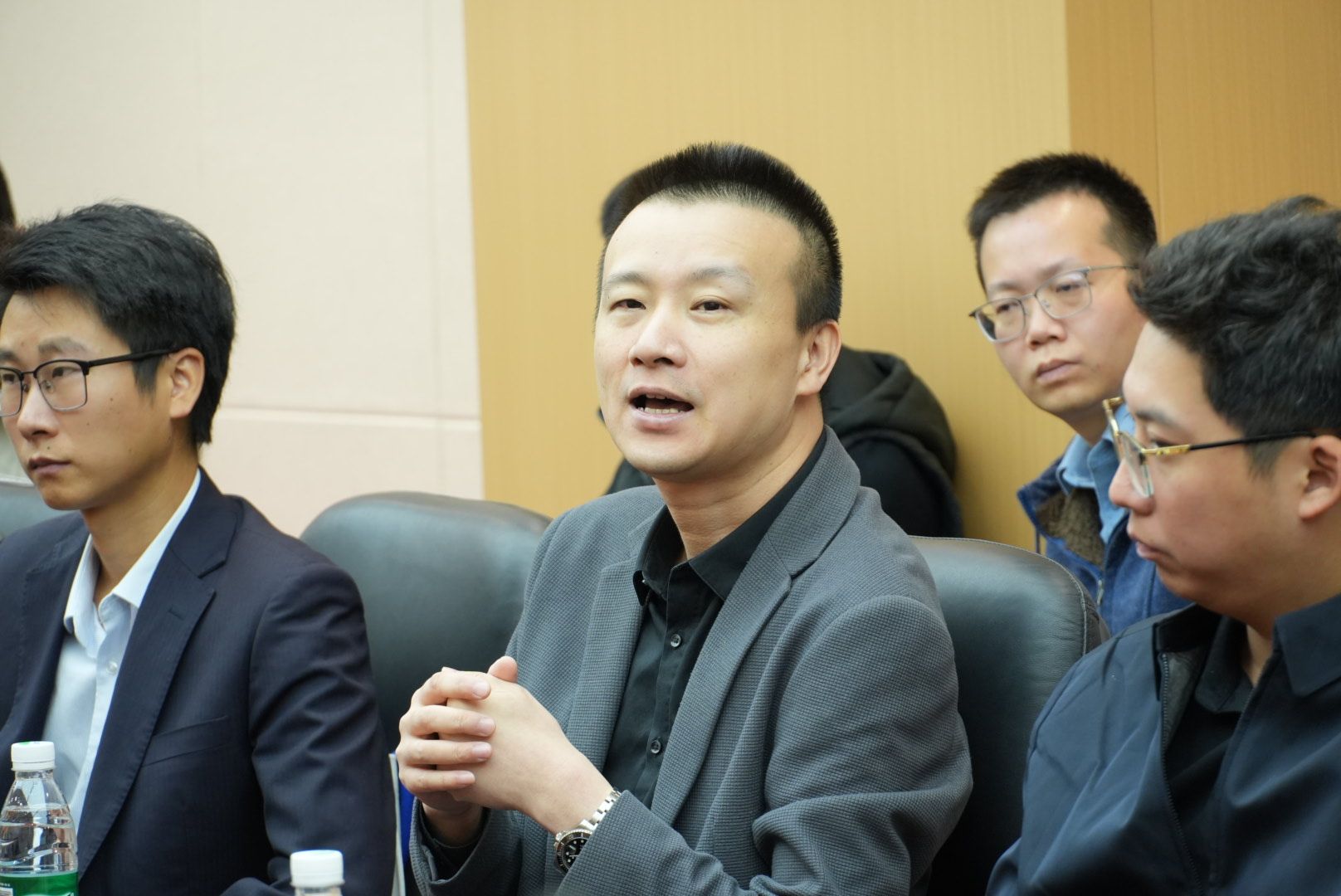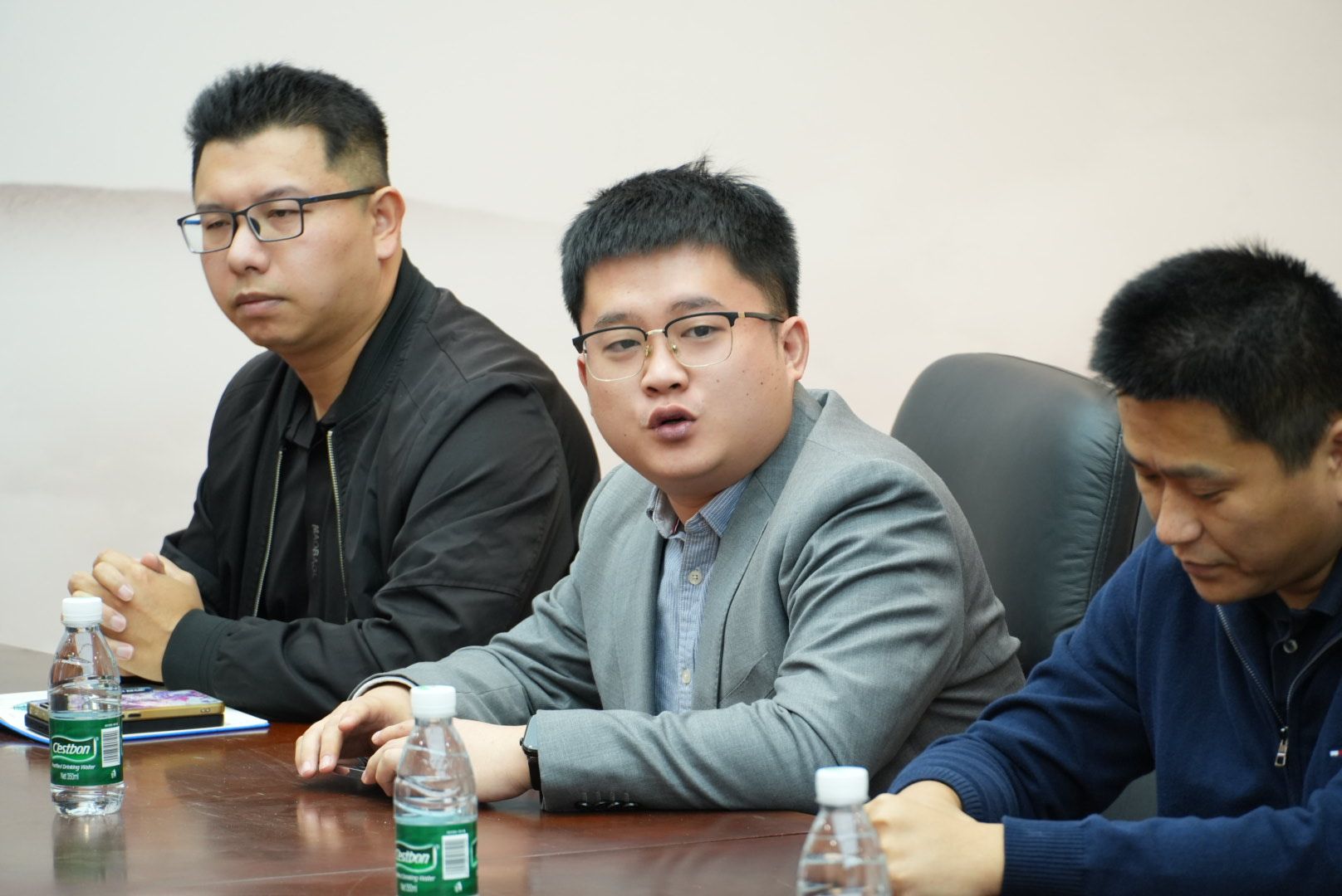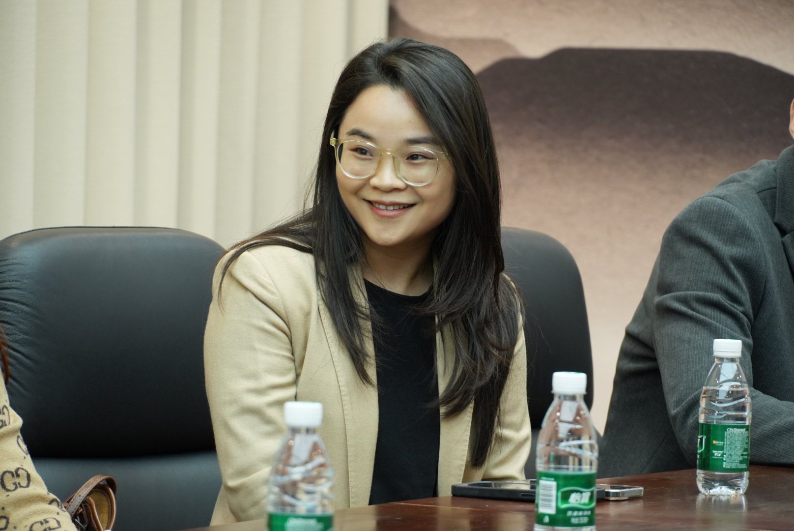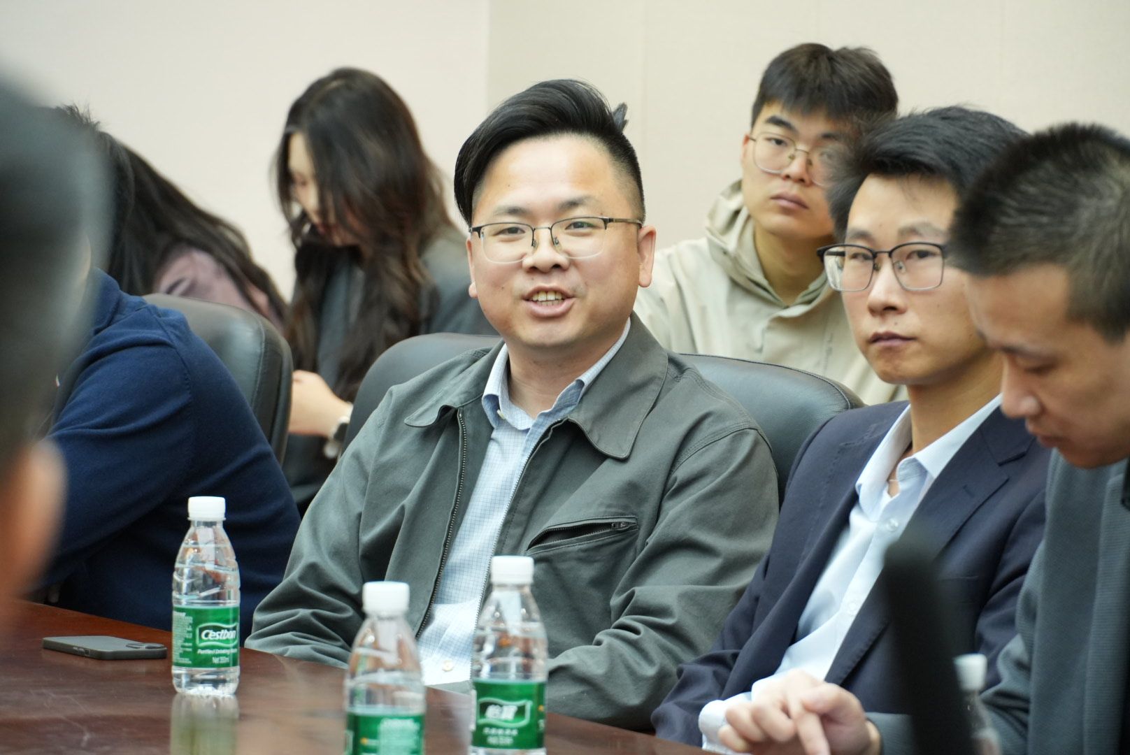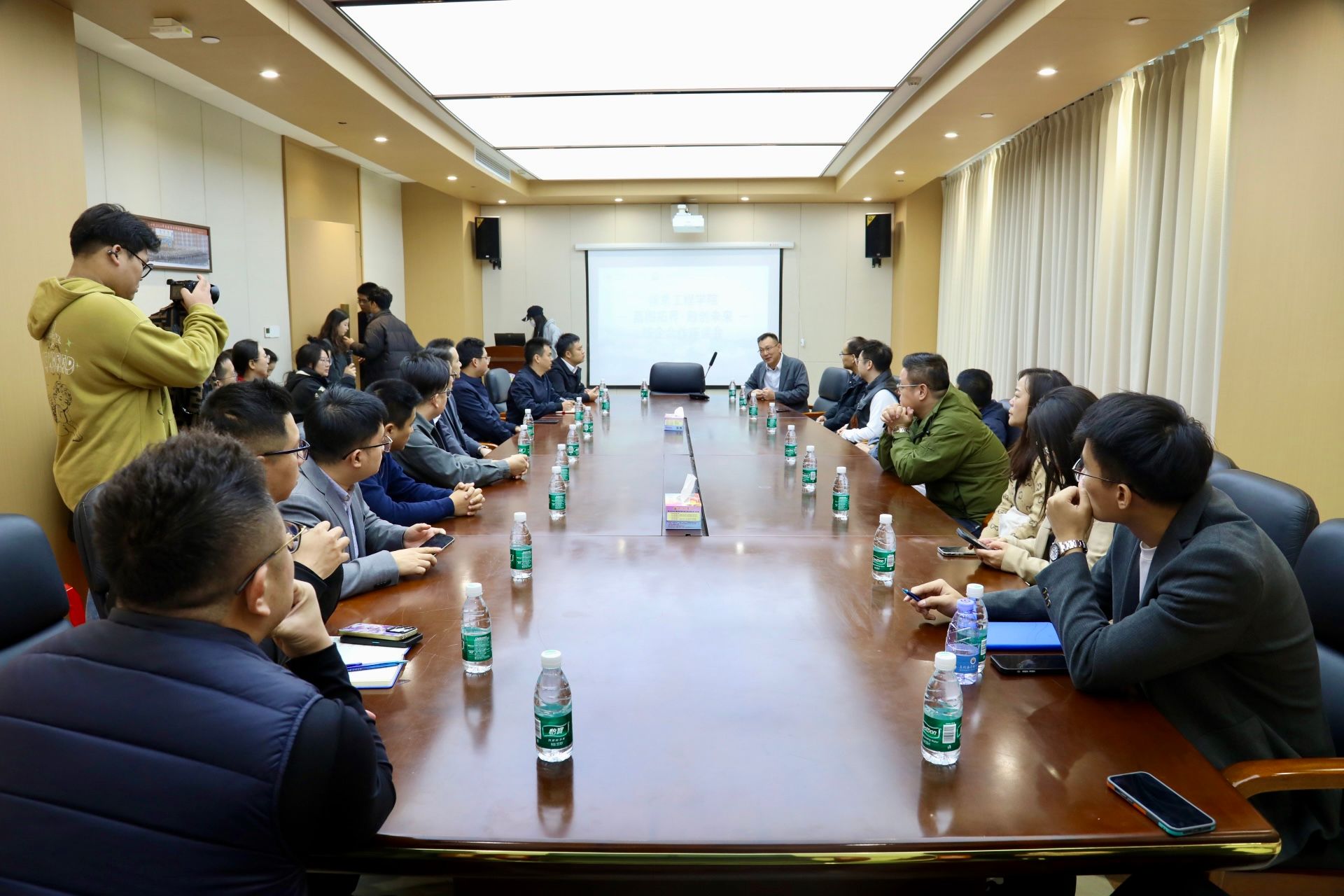 仪式结束后,校企双方移步图书馆103会议室,召开“蓝图拓界,融创未来”合作座谈会。与会企业代表围绕人才共育、课程共建等议题畅所欲言。福建鸿官通信工程有限公司林主任明确表示,公司将把党建共建作为深化合作的重要抓手,不仅优先招聘泉海学子,还将全力支持与学院共建省级标杆党支部,实现资源共享、人才共育。校友企业代表吴华焕则表达了在信息技术、艺术设计等领域吸纳学弟学妹加入的意愿,并愿共建实战平台,助力学生把握行业机遇。