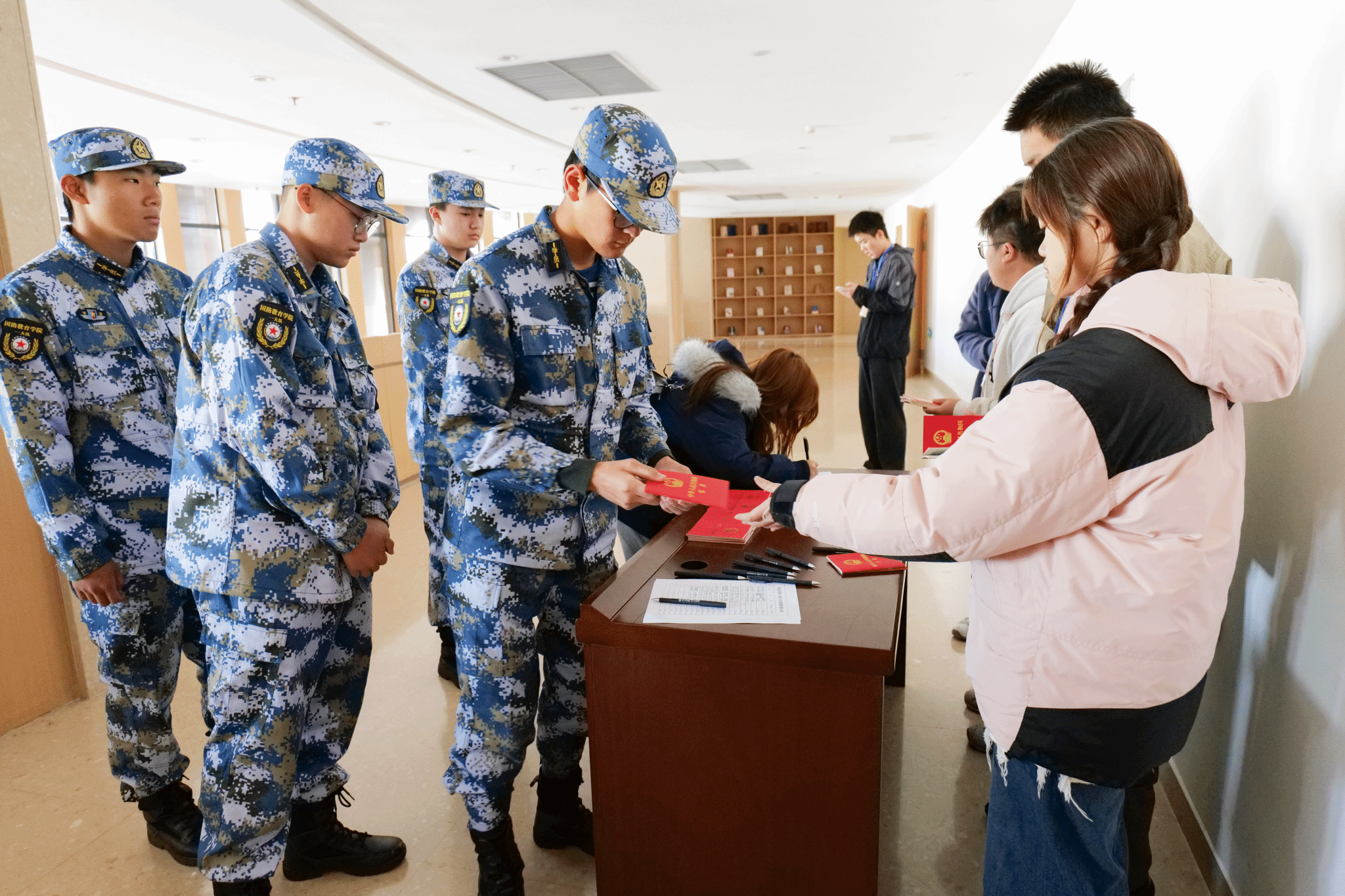 活动开始前,学校法务处普法宣传小组一一发放宪法宣传手册。同学们有序领取、认真翻阅。