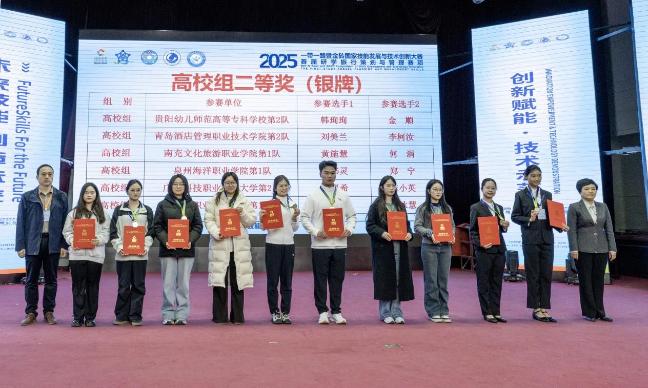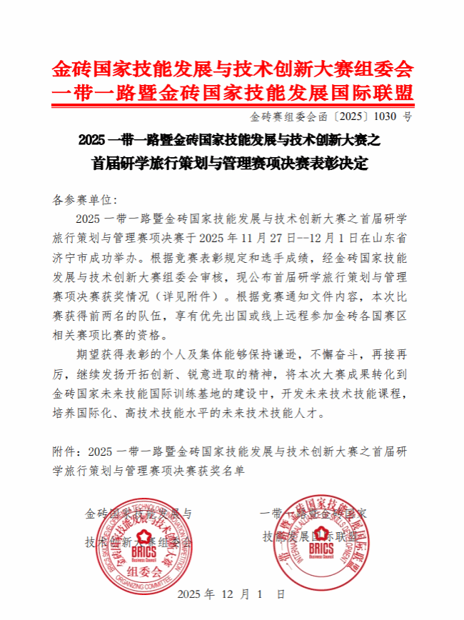 (新闻中心讯 健康休闲学院、航海交通学院供稿 党委宣传部报道)近日,2025“一带一路”暨金砖国家技能发展与技术创新大赛——首届研学旅行策划与管理赛项全国总决赛在山东济宁落幕。由我校健康休闲学院闫花帅老师、航海交通学院潘芳芷老师联合指导,郑宁、徐书灵两位同学组成的参赛团队,凭借扎实的专业基础与出色的现场表现,在全国56支高校组参赛队伍中脱颖而出,荣获全国总决赛高校组二等奖,总排名位列全国第15名。同时,闫花帅、潘芳芷两位老师获评“优秀指导教师”,学校荣获“优秀组织奖”。