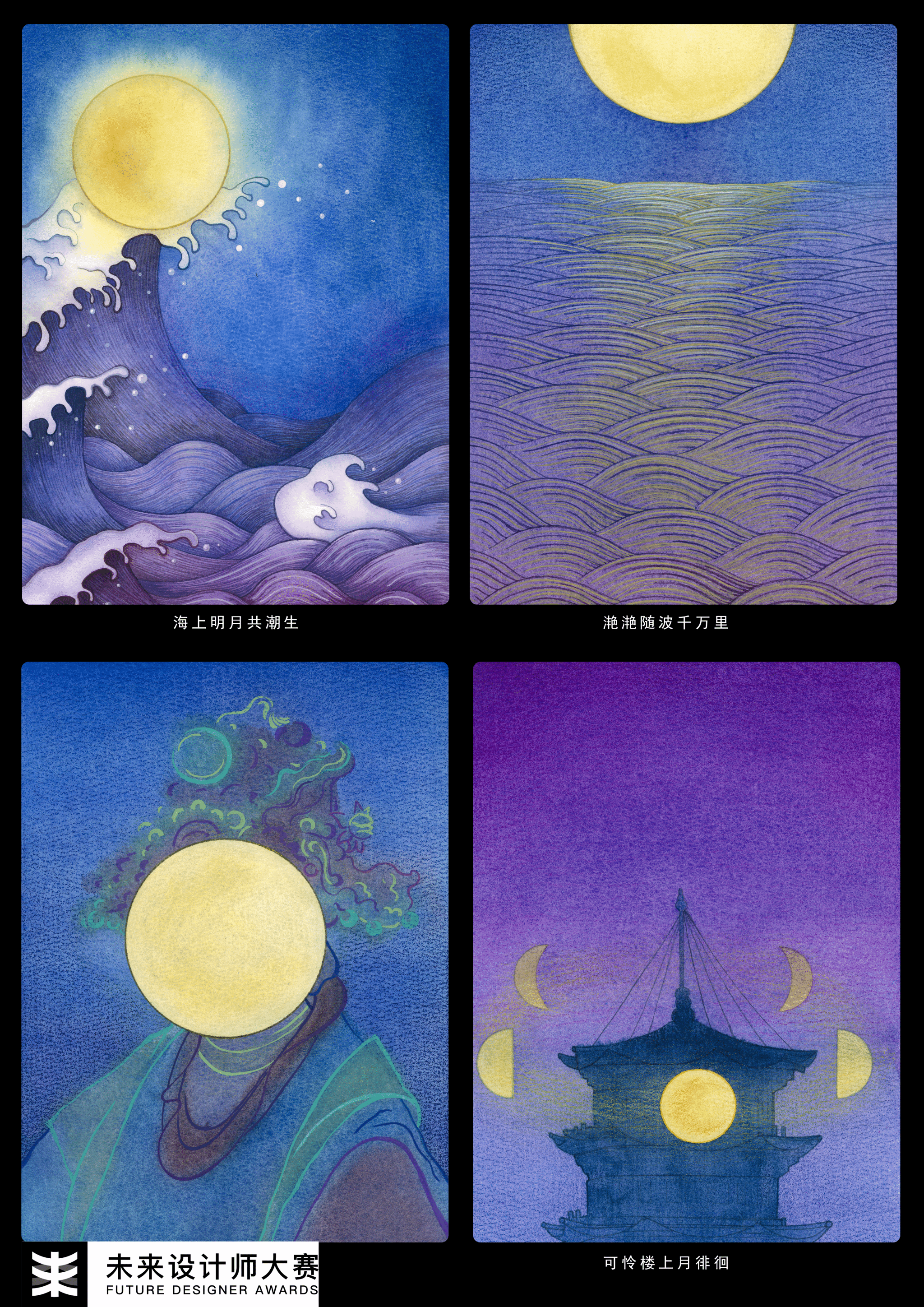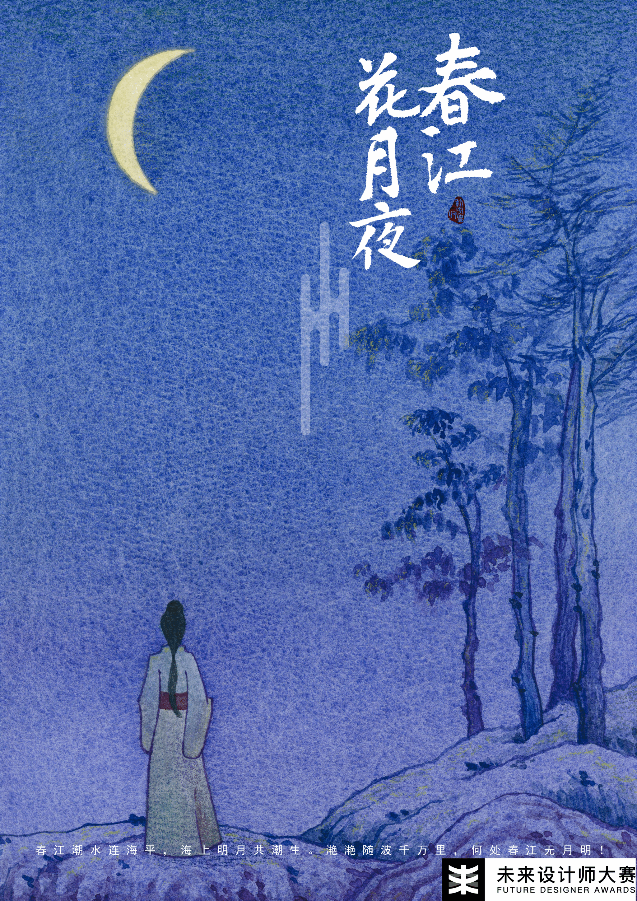 作品以中国唐代诗人张若虚的《春江花月夜》诗句作为载体,通过对诗句的意境解构理解再造创作,在创作过程中融合了大量中国传统绘画的表意手法,托物言志形式去塑造我的作品,通过手绘的形式,利用当代的绘画综合材料,尝试采用了水彩、彩铅、色粉、咖啡、丙烯、盐等综合自然物质进行创作,最后采用数字绘画结合的形式将此作品完成。