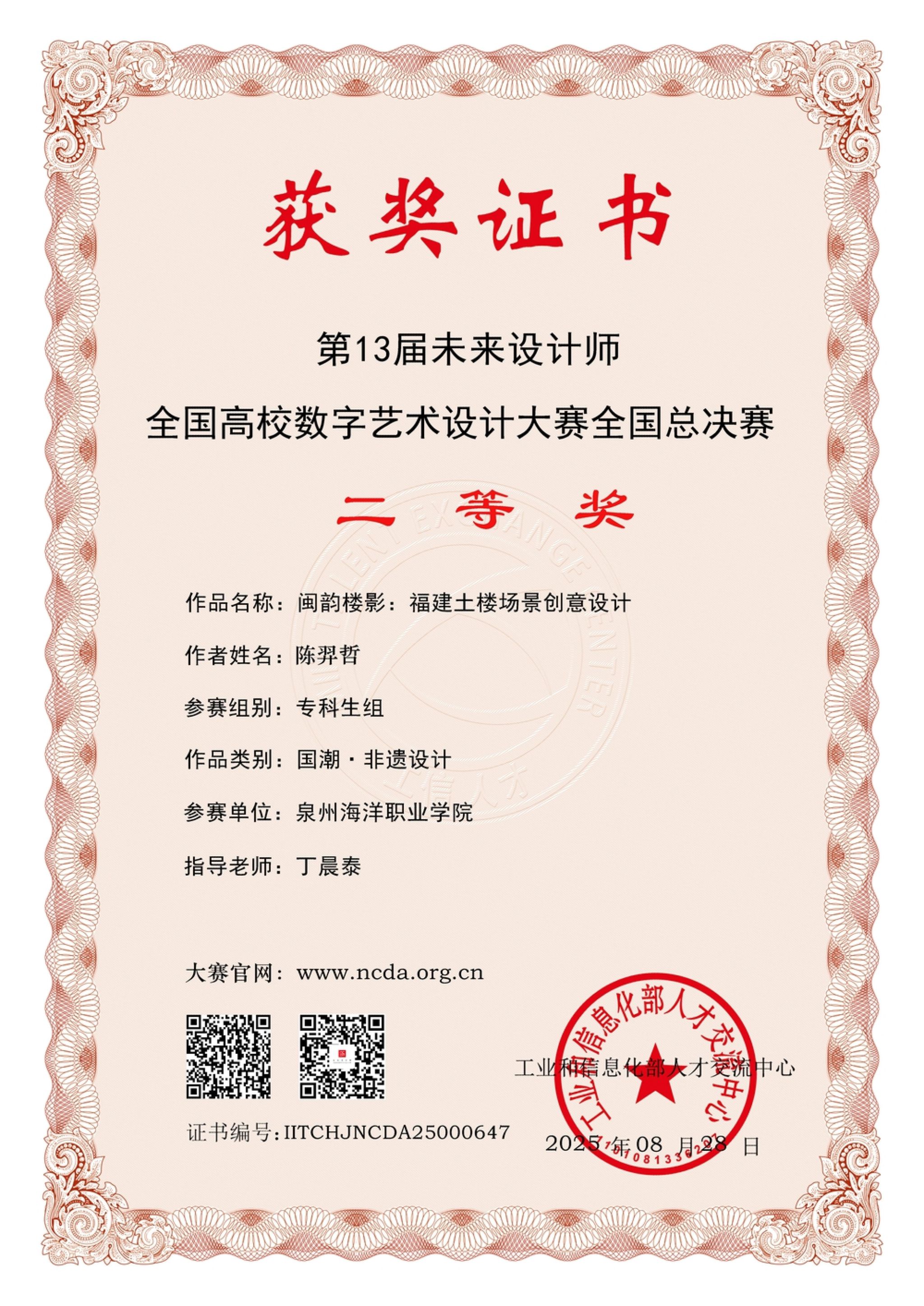 自大赛启动以来,信息工程学院高度重视、精心组织,广泛动员师生参与赛事。通过组建专业指导教师团队,对参赛作品进行多轮打磨,信息工程学院最终选出33支优秀团队参加省赛角逐。经过激烈竞争,由郭长磊、郑怀宇老师指导学生郭晶晶作品《春江花月夜》插画设计、丁晨泰老师指导学生陈羿哲作品《闽韵楼影:福建土楼场景创意设计》荣获省赛一等奖,并作为省赛优秀代表晋级国赛,分别斩获国家级二等奖。