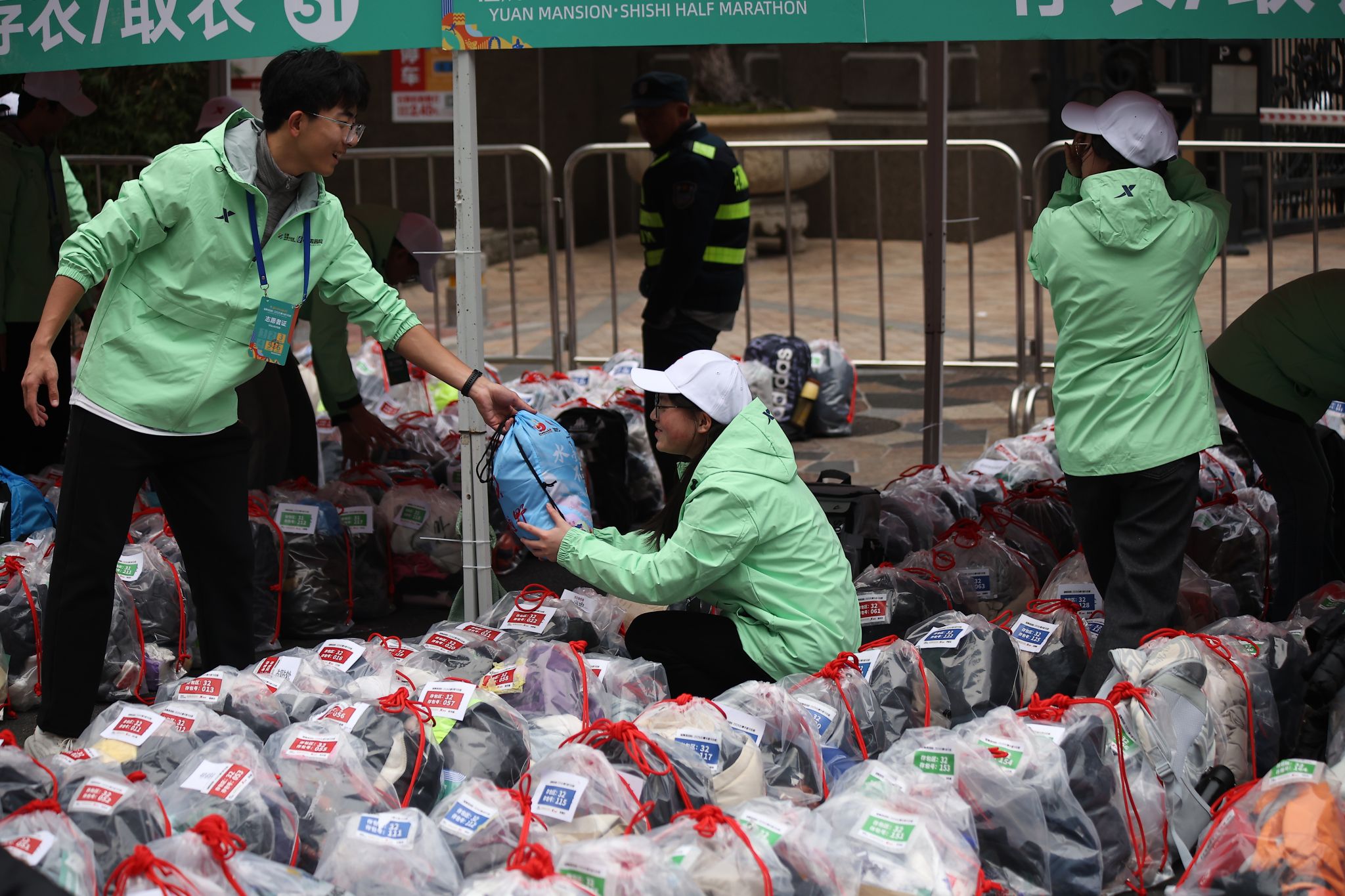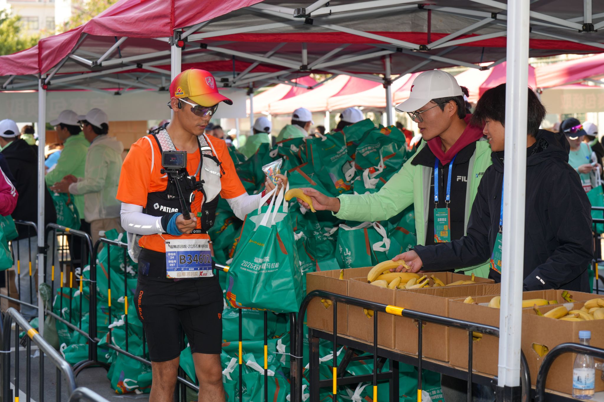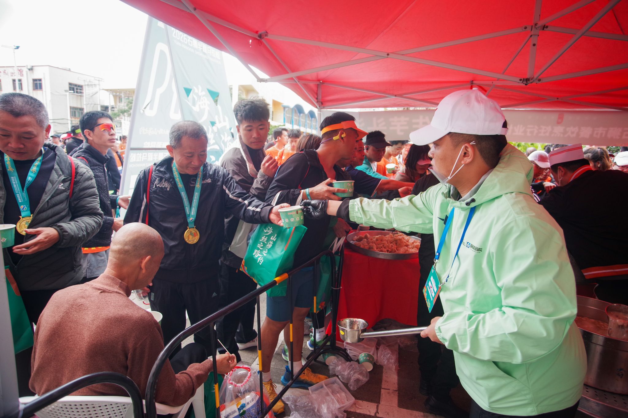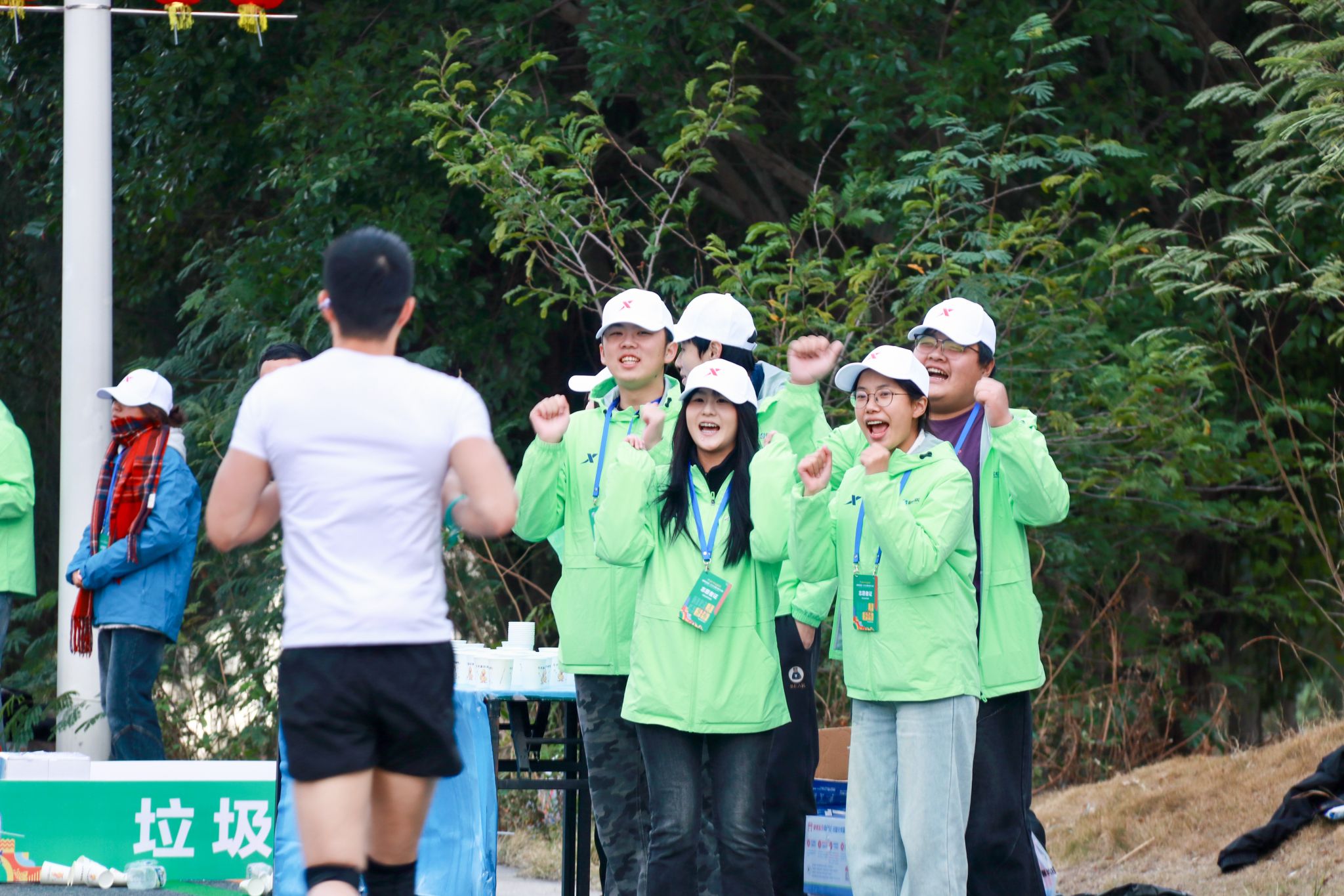 从起点到终点,安检区、存衣区、饮水站、检录口、补给站、医疗点等各个岗位,随处可见他们忙碌的身影。补给站的志愿者提前将饮用水、食物等摆放整齐,及时为跑者递上补给,并送上“加油,坚持住!”的真诚鼓励。从晨光熹微到暖阳高照,他们始终坚守岗位,成为跑者突破自我的“精神加油站”。