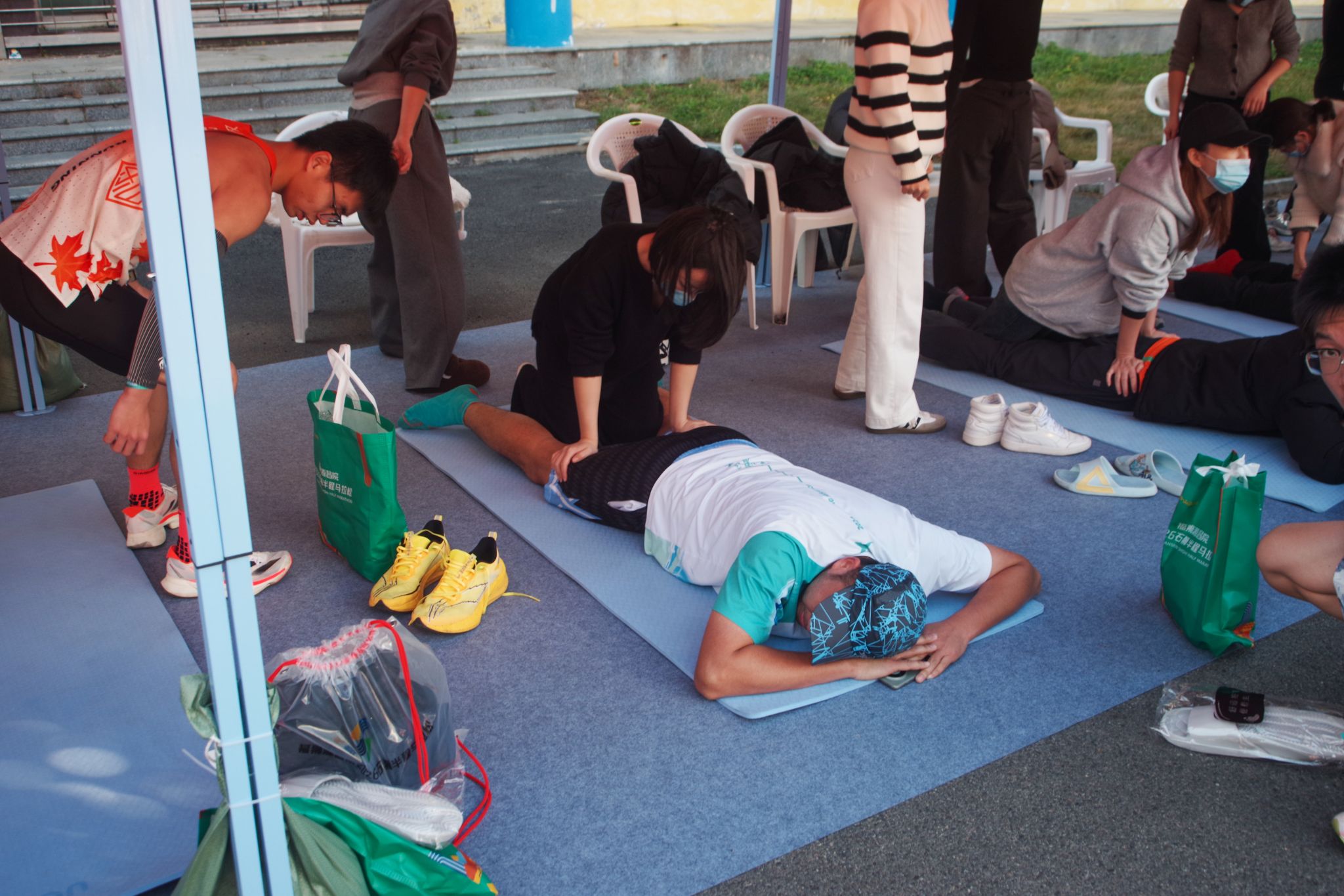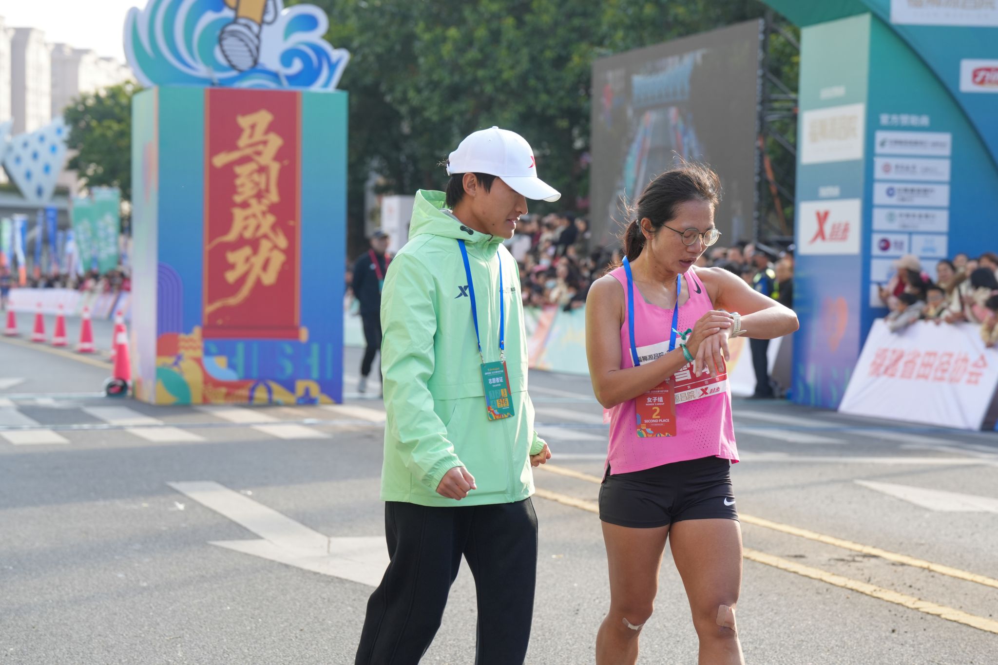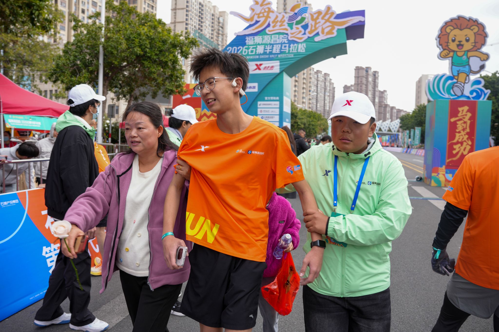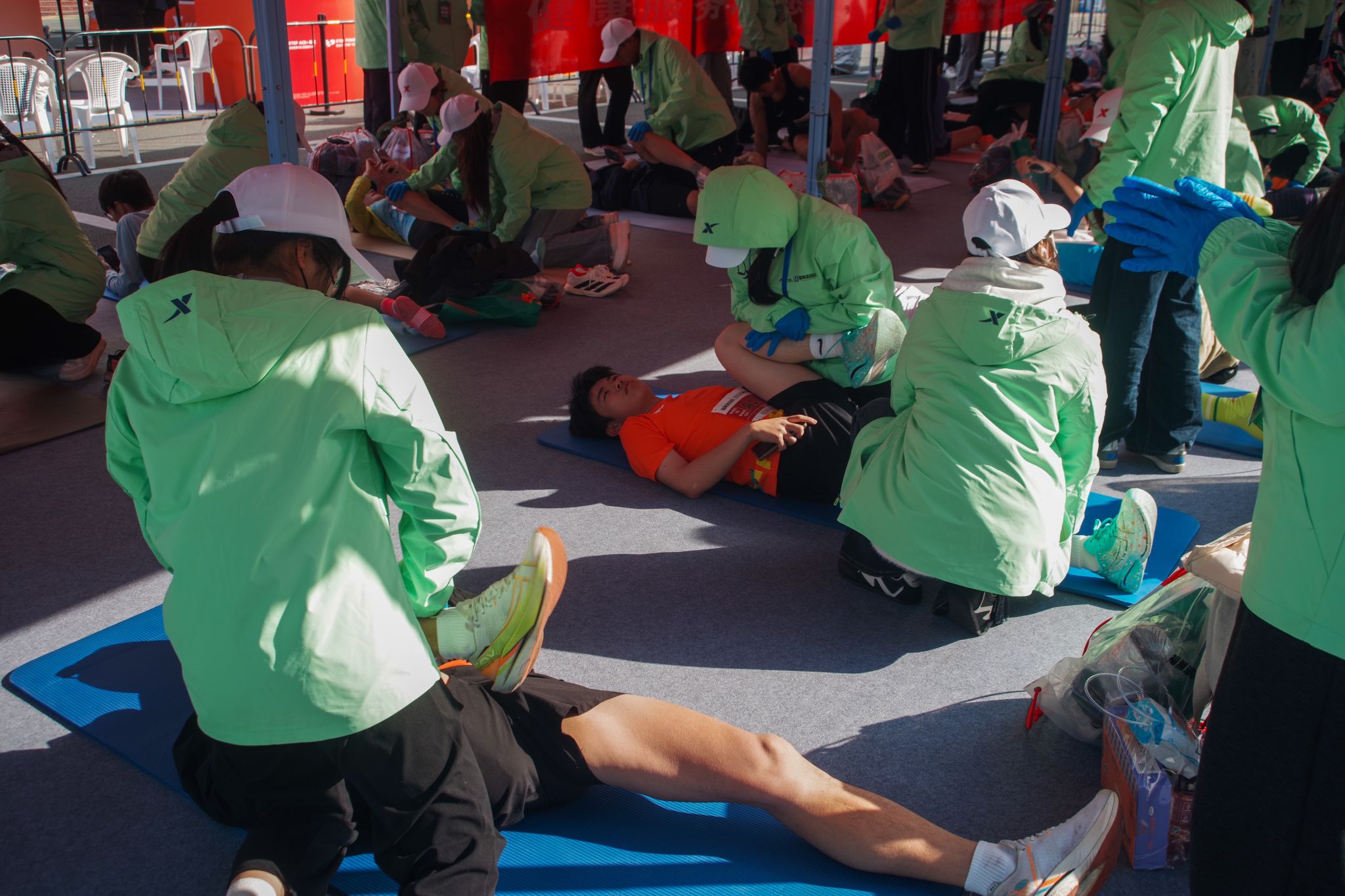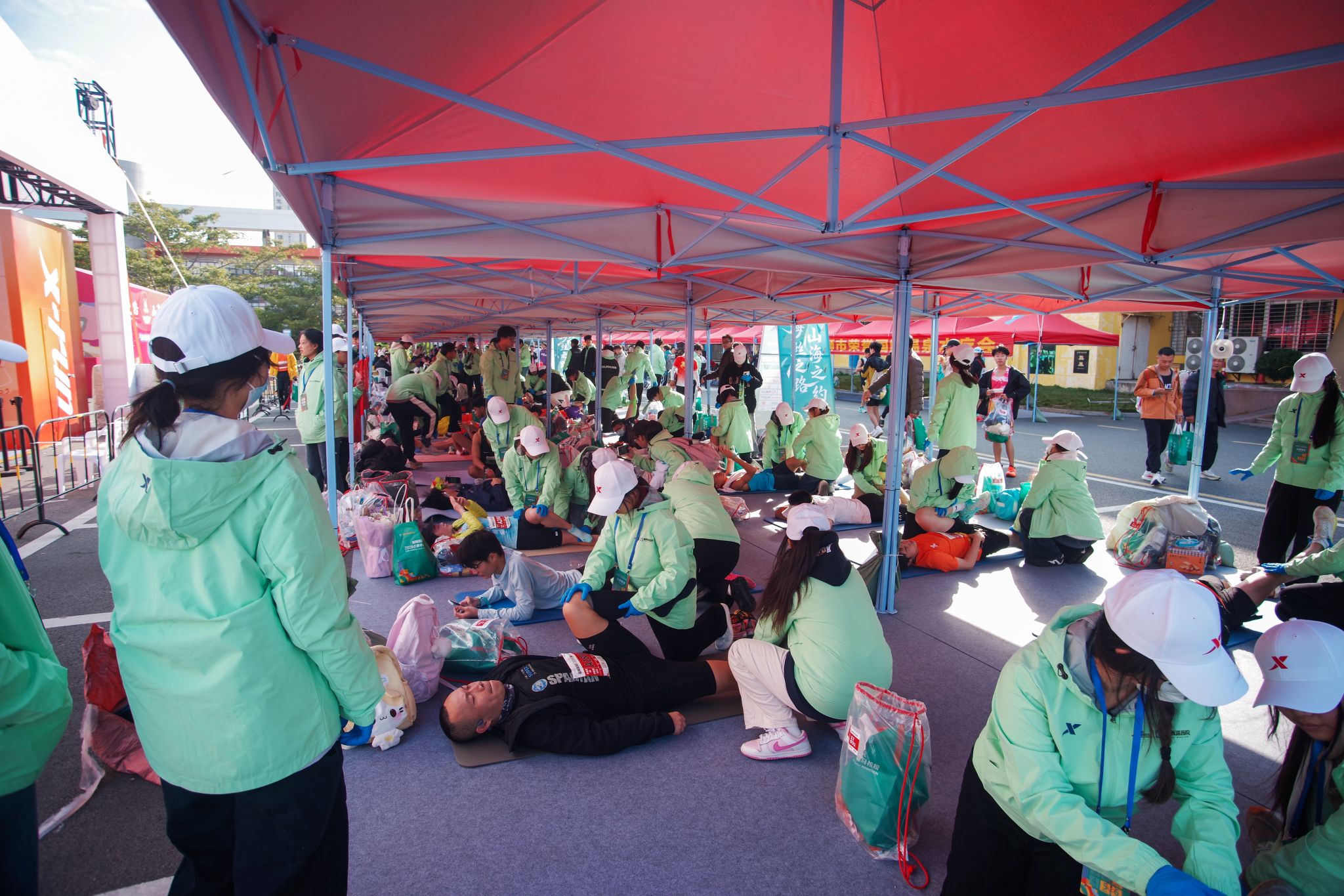 当首位跑者冲过终点,完赛区的志愿者早已准备就绪。他们分属拉伸区、冰敷区、美食区等不同小组,以高效协作迎接每一位完赛选手。志愿者双手奉上奖牌,轻声道贺“恭喜完赛”;在拉伸区,经过专业培训的志愿者耐心为跑者放松肌肉,缓解运动疲劳;存取衣物的志愿者则认真核对号码,确保物品准确归还。