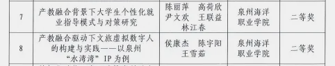 获奖论文立足职教前沿,聚焦产教融合核心议题,具有鲜明的实践价值与理论创新。其中,《产教融合背景下大学生个性化就业指导模式与对策研究》创新构建“精准画像-动态跟踪-精准匹配”就业指导体系;《产教融合驱动下文旅虚拟数字人的构建与实践——以泉州“水湾湾”IP为例》深度融合数字技术与文旅产业,为区域文化传承与创新发展提供了新思路;《产教融合背景下职业院校学生实习实训管理路径探析》系统梳理了实习管理痛点,提出校企协同管理新模式。三篇论文从不同维度展现了我校教师紧跟产业需求、深耕教学实践的科研活力。