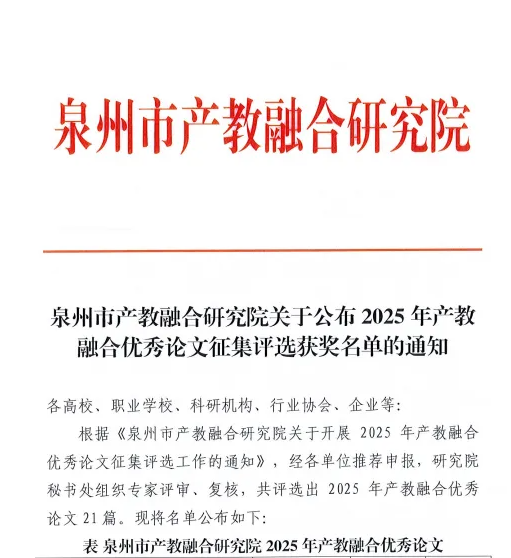 (新闻中心讯 教务处供稿 党委宣传部报道)近日,泉州市产教融合研究院正式发布2025年产教融合优秀论文评选结果,我校喜获佳绩,共有三篇论文脱颖而出。