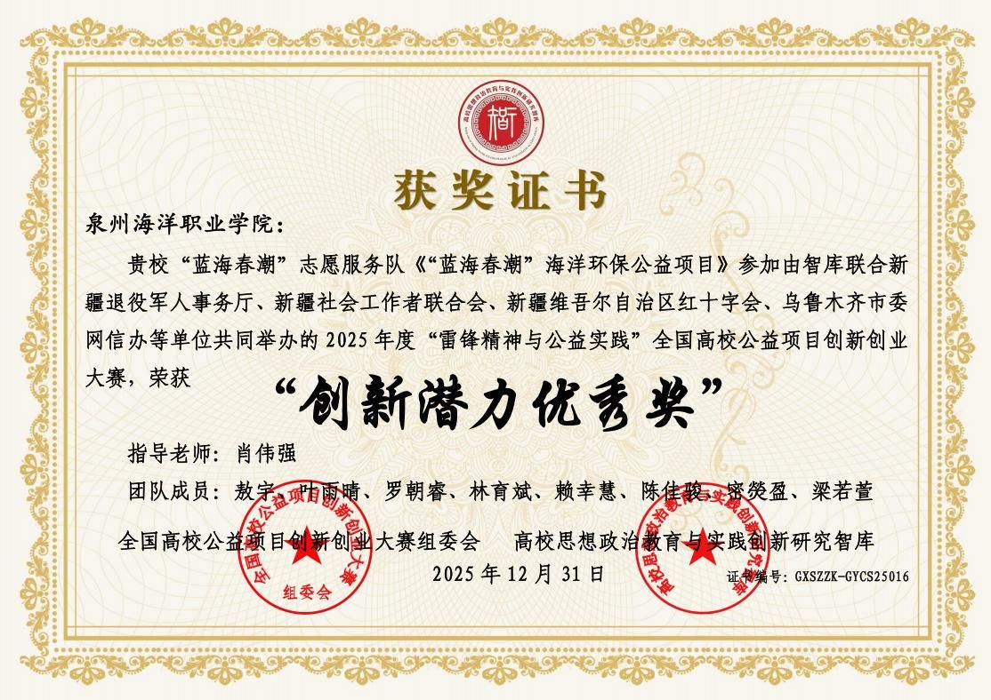 此次获奖,既是对团队长期以来坚持公益实践、专注海洋保护的认可,也体现了我校在实践育人、公益育人方面的持续努力。未来,学校将持续深化“33222”育人体系,广泛搭建实践平台,通过“项目设计-实践验证-成果转化”的闭环机制,引导学生从情感认同走向持续行动,培养具有社会责任感和实践能力的青年人才。