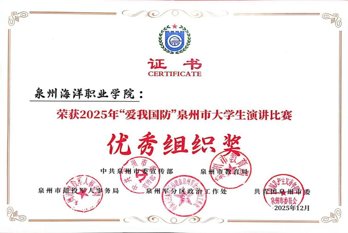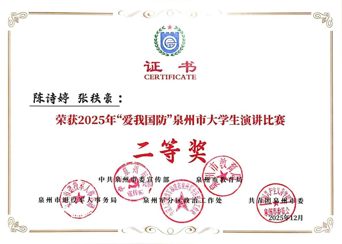 (新闻中心讯 校团委供稿 党委宣传部报道)2025年“爱我国防”泉州市大学生演讲比赛于日前传来佳讯,我校参加决赛的10名师生全部获奖,表现突出。