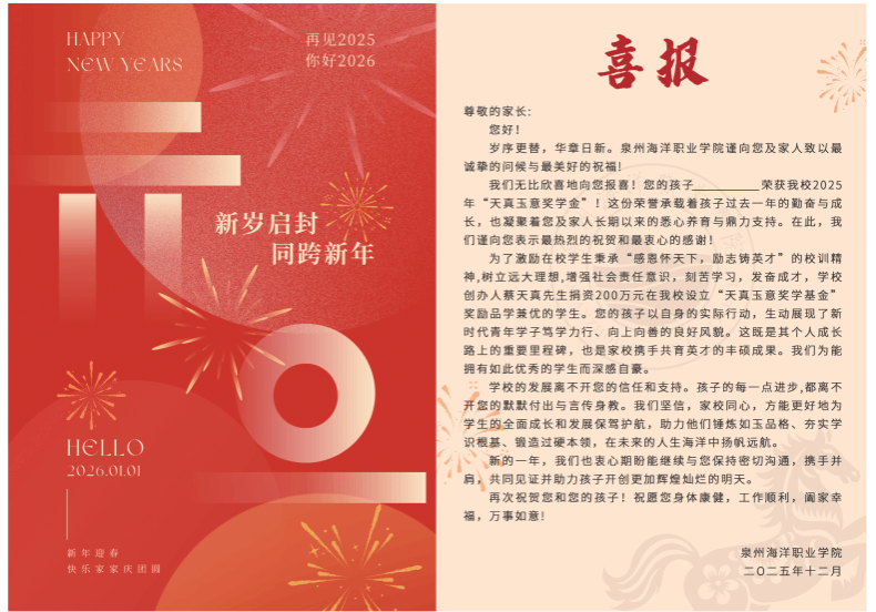 (新闻中心讯 党委学生工作部供稿 党委宣传部报道)岁序更替,华章日新,马蹄踏春,佳音即至。值此2026年丙午马年新春佳节,一封封承载着荣誉与期许的“天真玉意奖学金”喜报,将泉州海洋职业学院的育人温度,送进每一位获奖学子的家门。