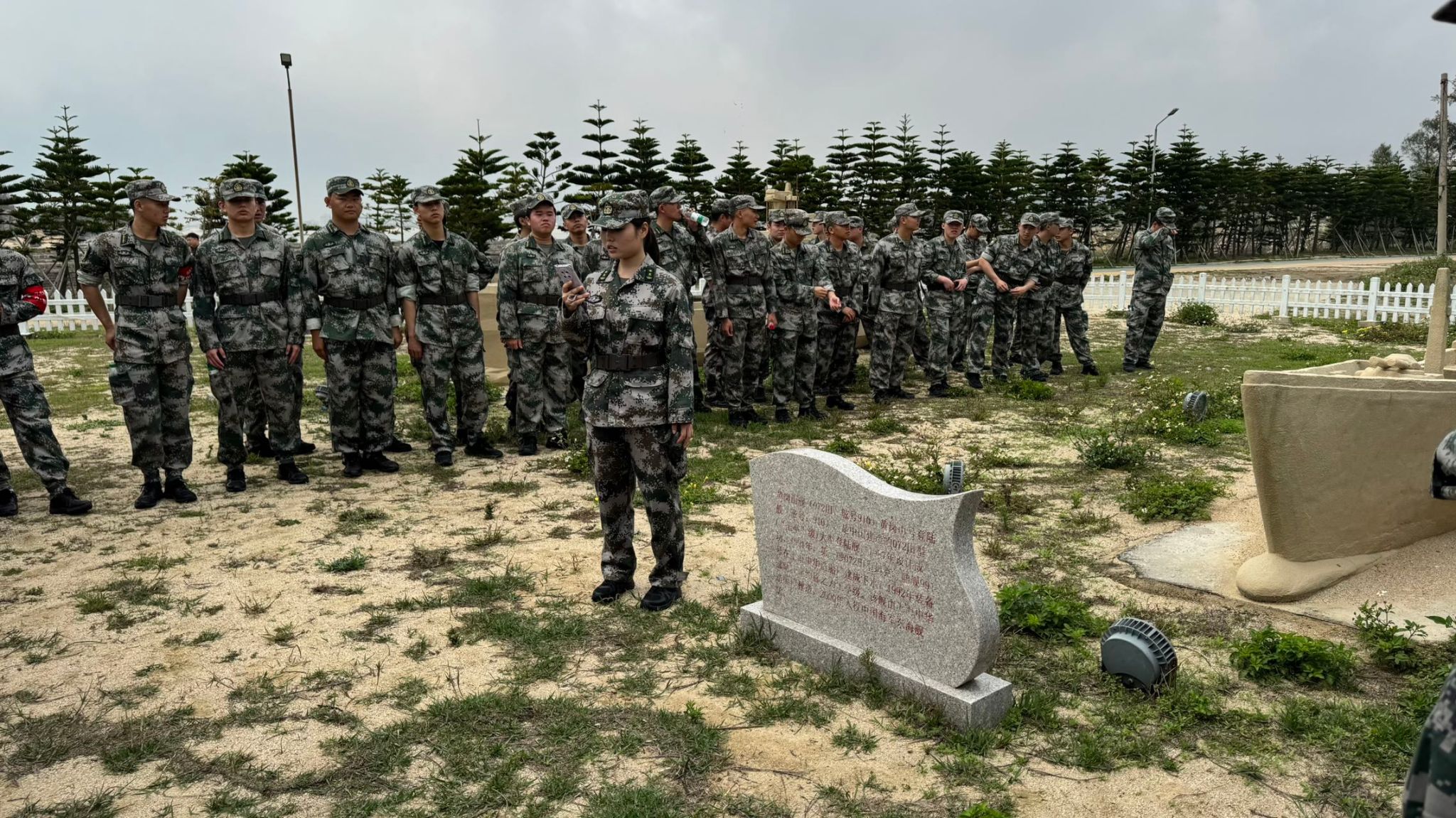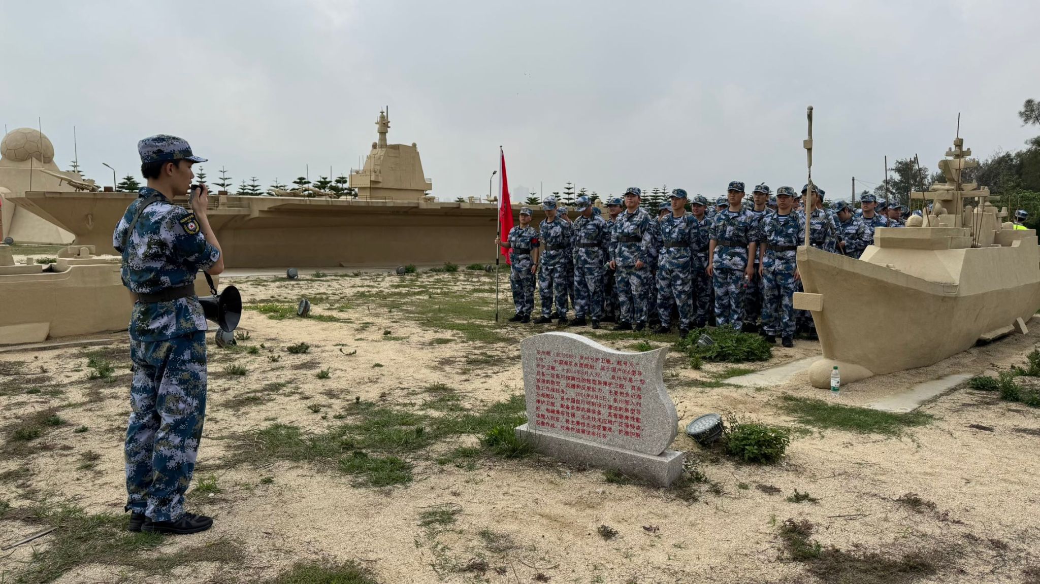 队伍按计划抵达军事公园集结地域。讲解员依托福建军舰沙塑模型,介绍了相关海防历史与舰艇知识,同学们列队聆听,神情专注。